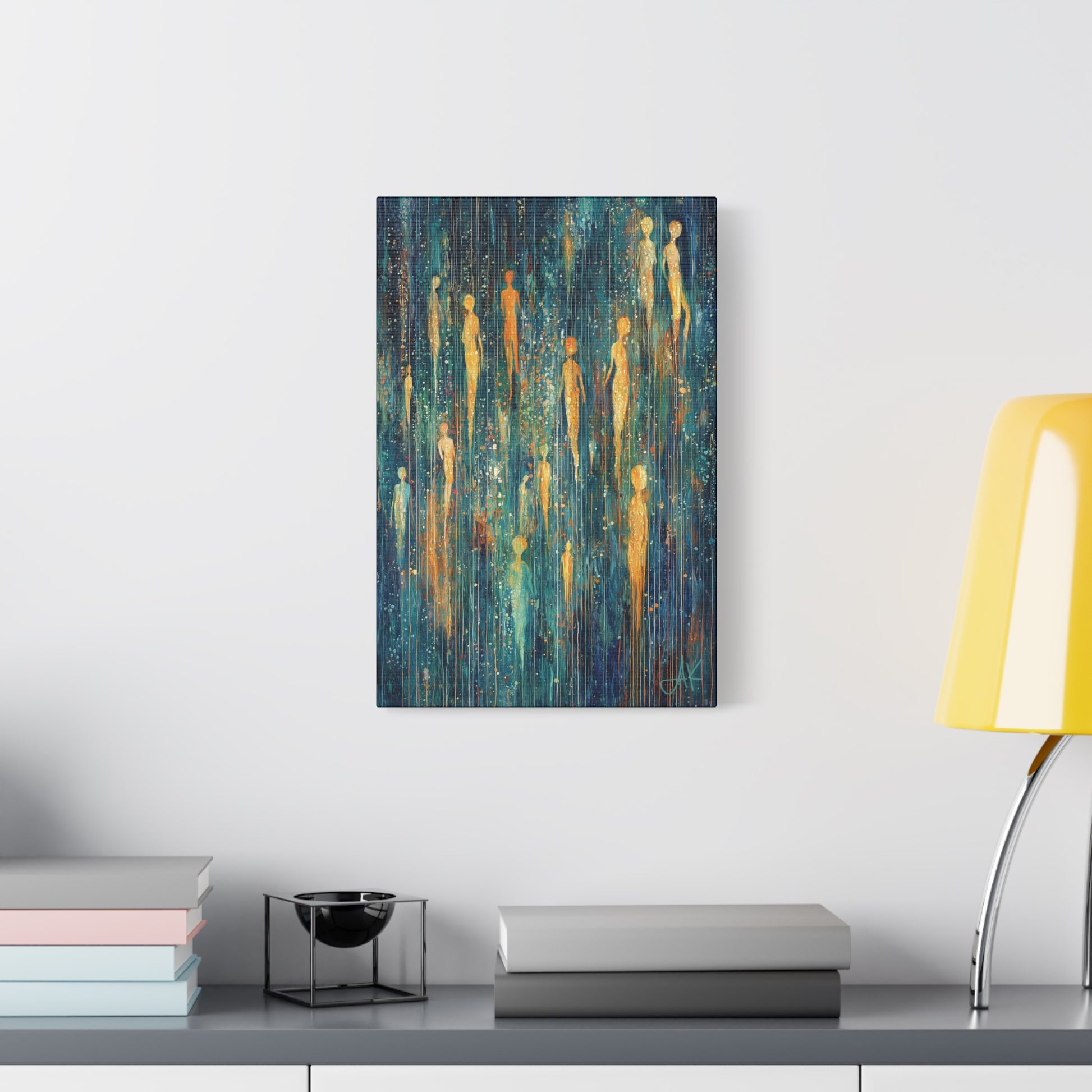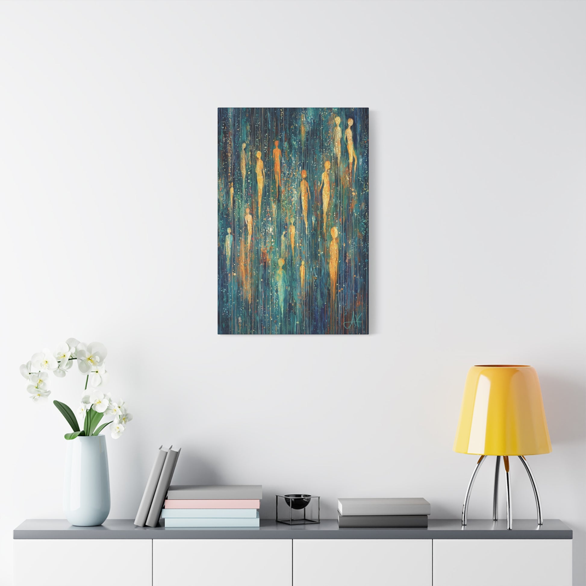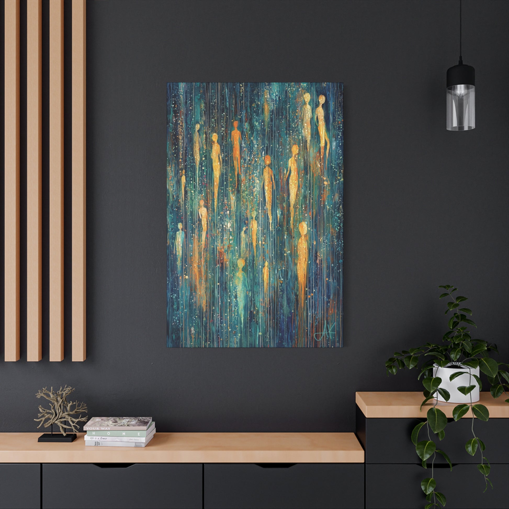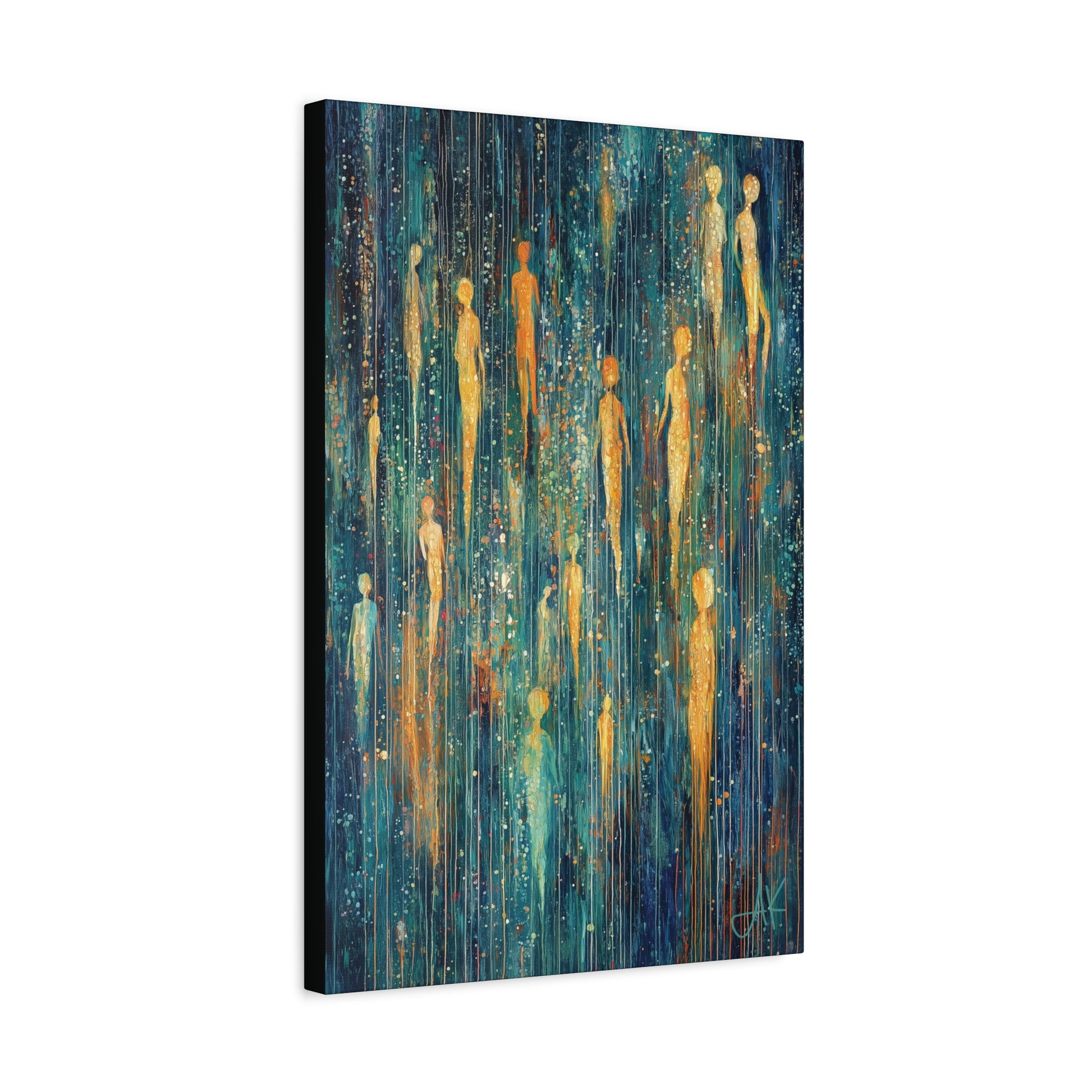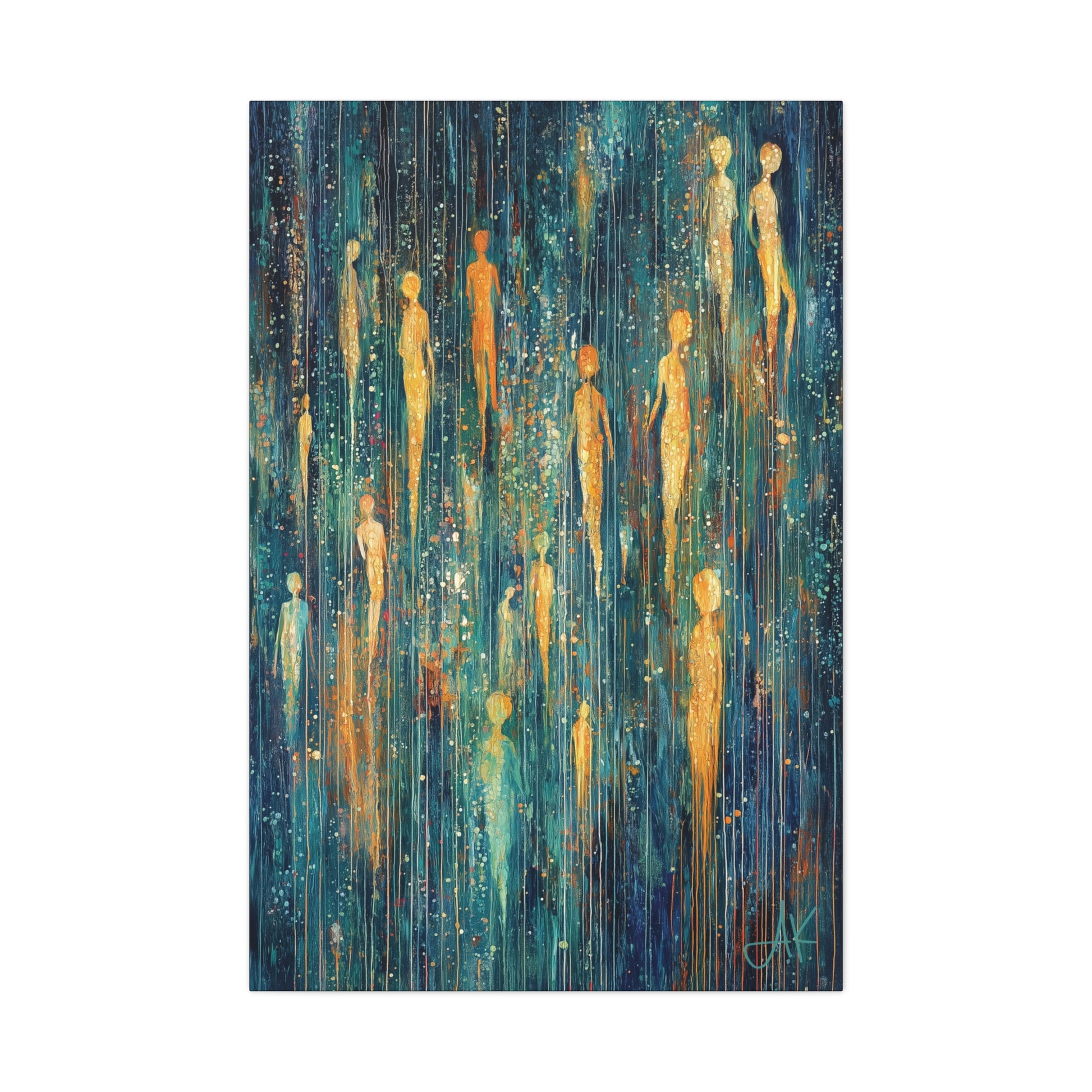 In Ancestral Memory, a deep teal and ocean-blue field is drawn downward into long, rain-like lines, as if time itself is falling through the frame. Across that vertical current, luminous human forms emerge in warm golds and pale mineral tones, suspended between presence and distance. Splatter and fine drip-work create a star-dust atmosphere, giving the surface a lived, hand-worked complexity that reads as painterly rather than decorative.