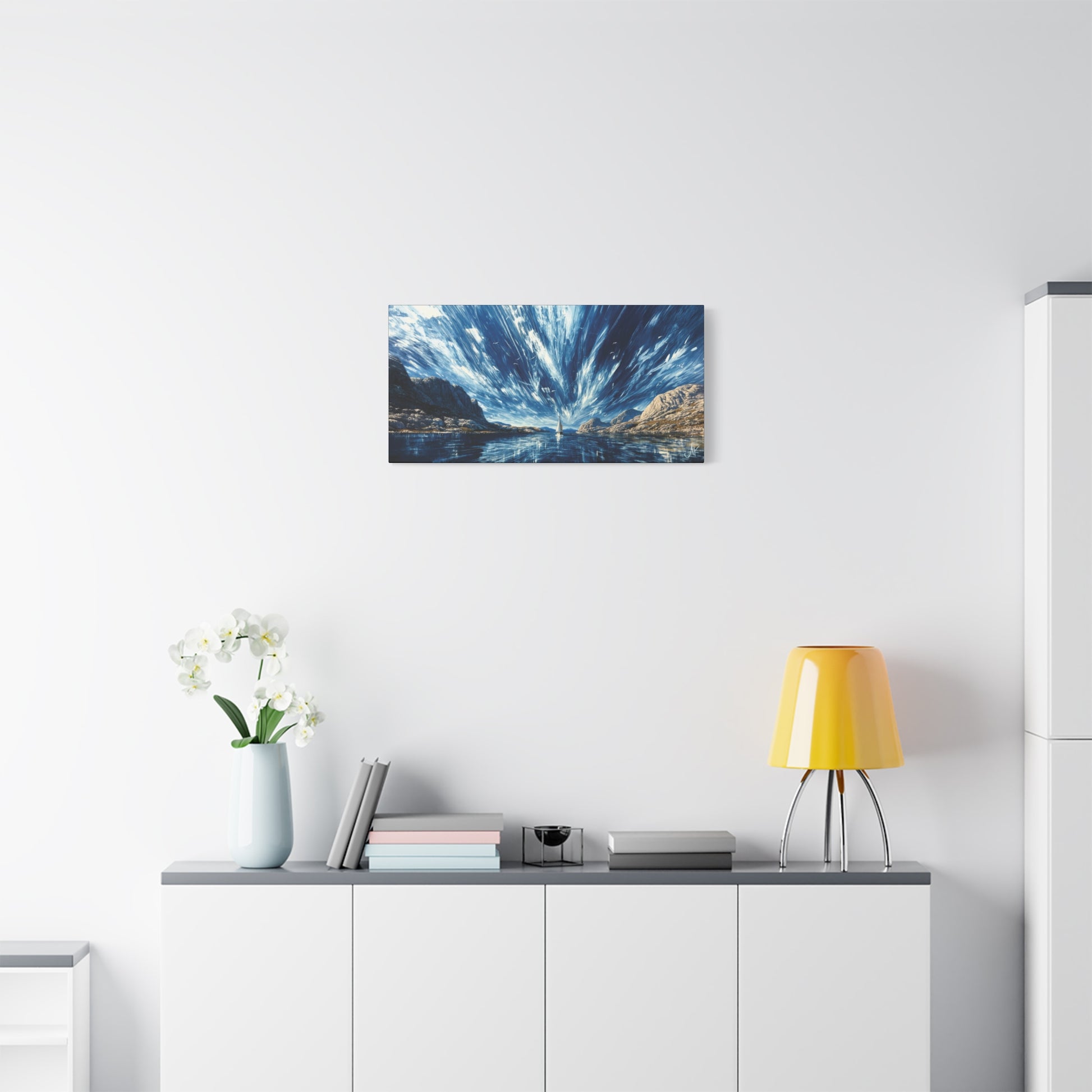 In Ancient Highway Racing Riven Sky, a narrow sailboat runs straight toward the viewer down a glassy Hebridean channel, its wake a thin white seam in an otherwise mirror-still sea. On either side, weather-carved rock rises in long, low ridges, anchoring the scene in an ancient coastline that feels both real and remembered. Above, the whole sky explodes into motion – bands of cloud riven into streaks of white and deep Atlantic blue that converge toward the boat in a rush of speed and light.
