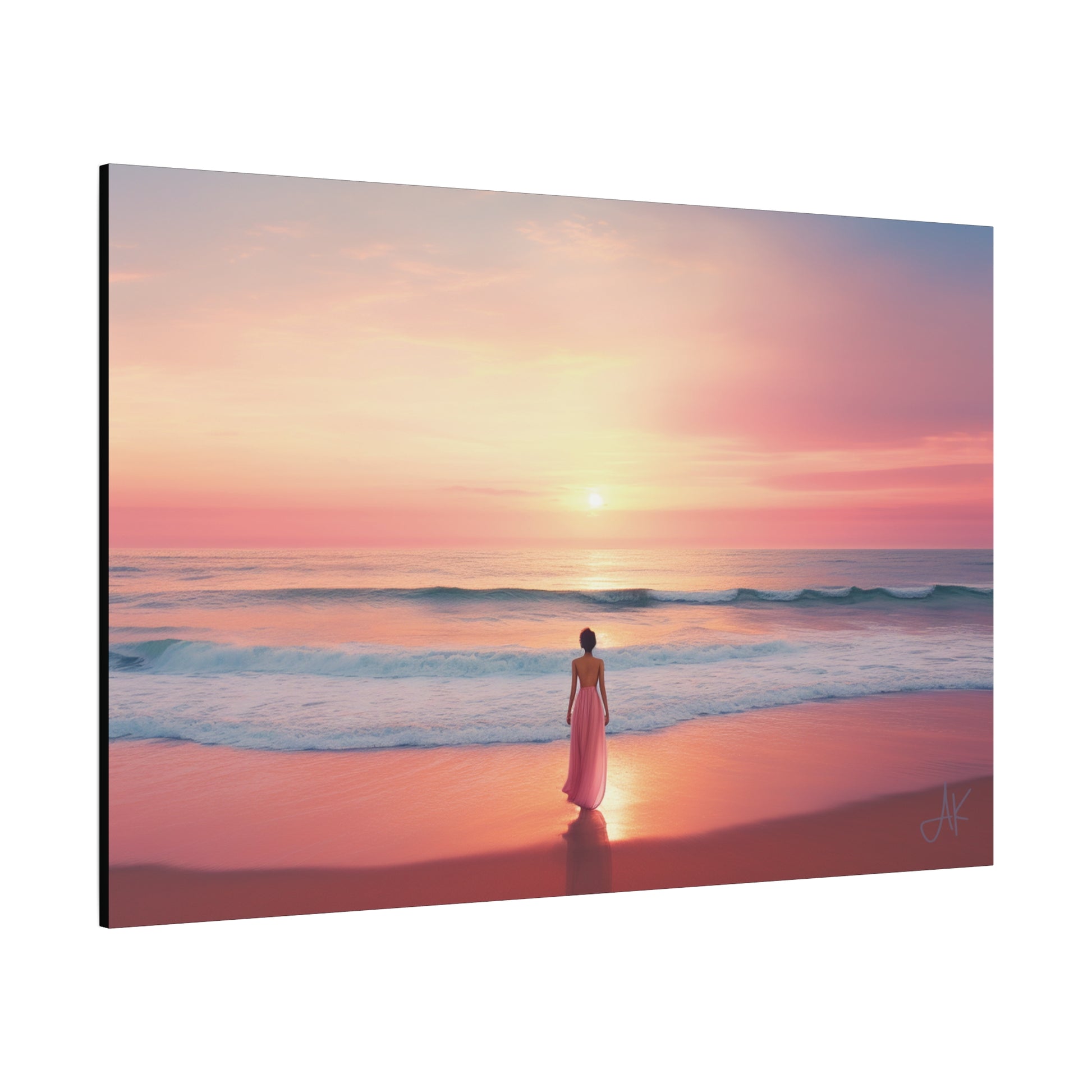 Divine Horizon is a serene coastal figurative, built from soft bands of surf and distant swell under a sky of peach, rose, and pale gold that dissolves upward into lilac and quiet blue. A lone, feminine figure stands at the water’s edge in a flowing pink dress, held in stillness against the breath of the tide. The sun sits low over the horizon and lays a luminous path across the sea and wet sand, turning the shoreline into a calm field of reflected light.