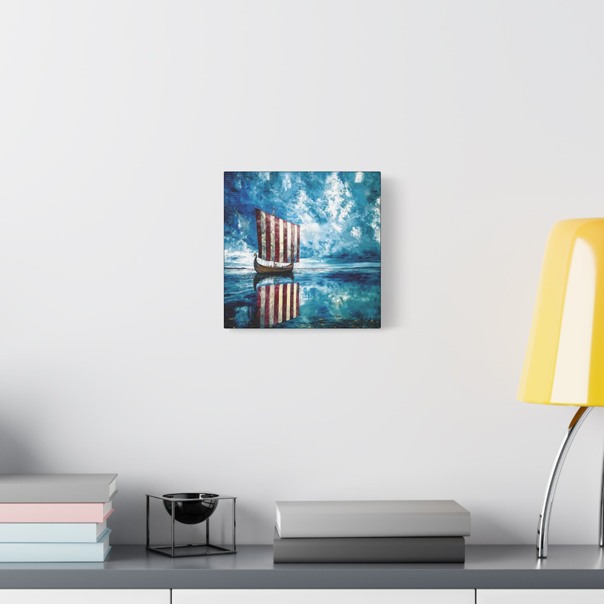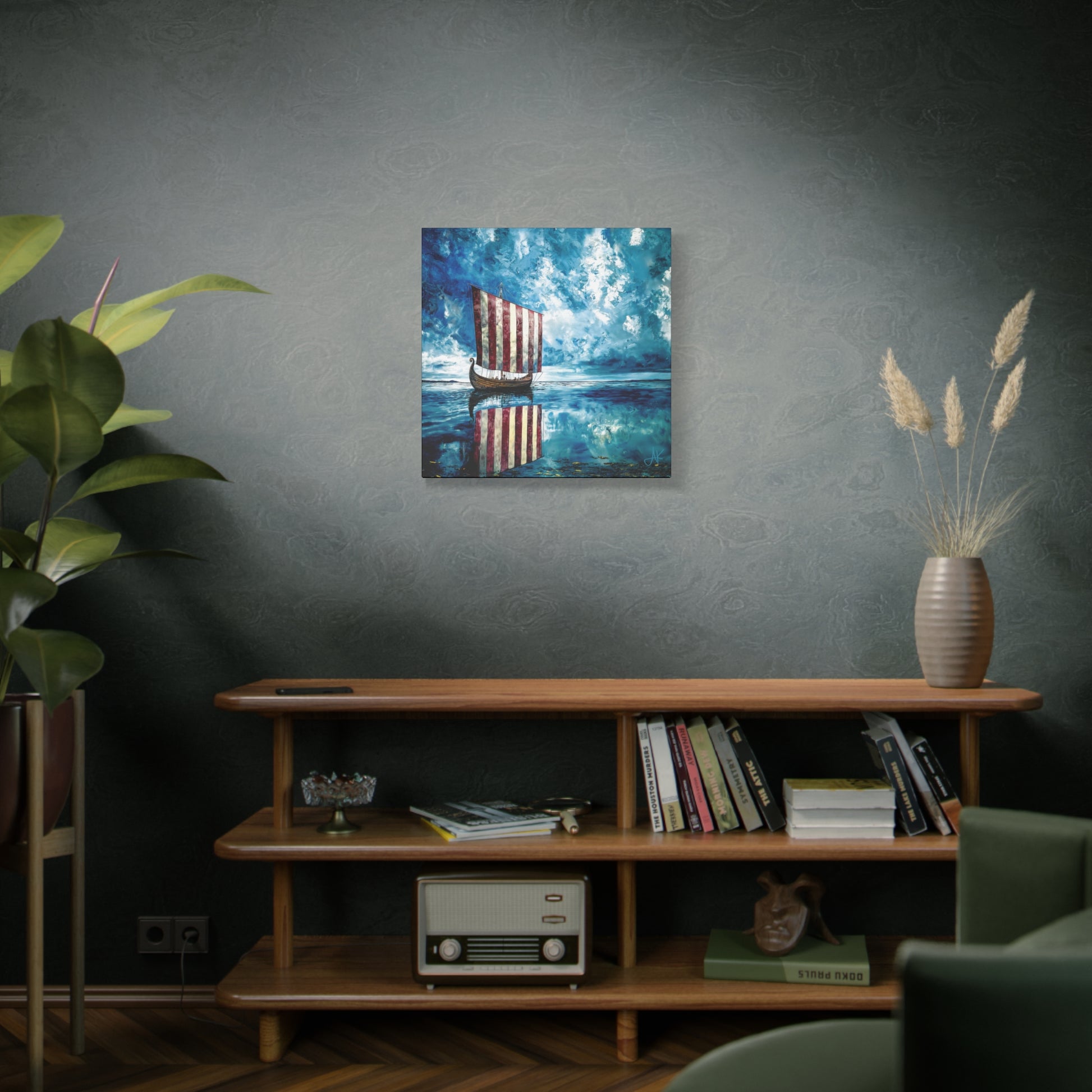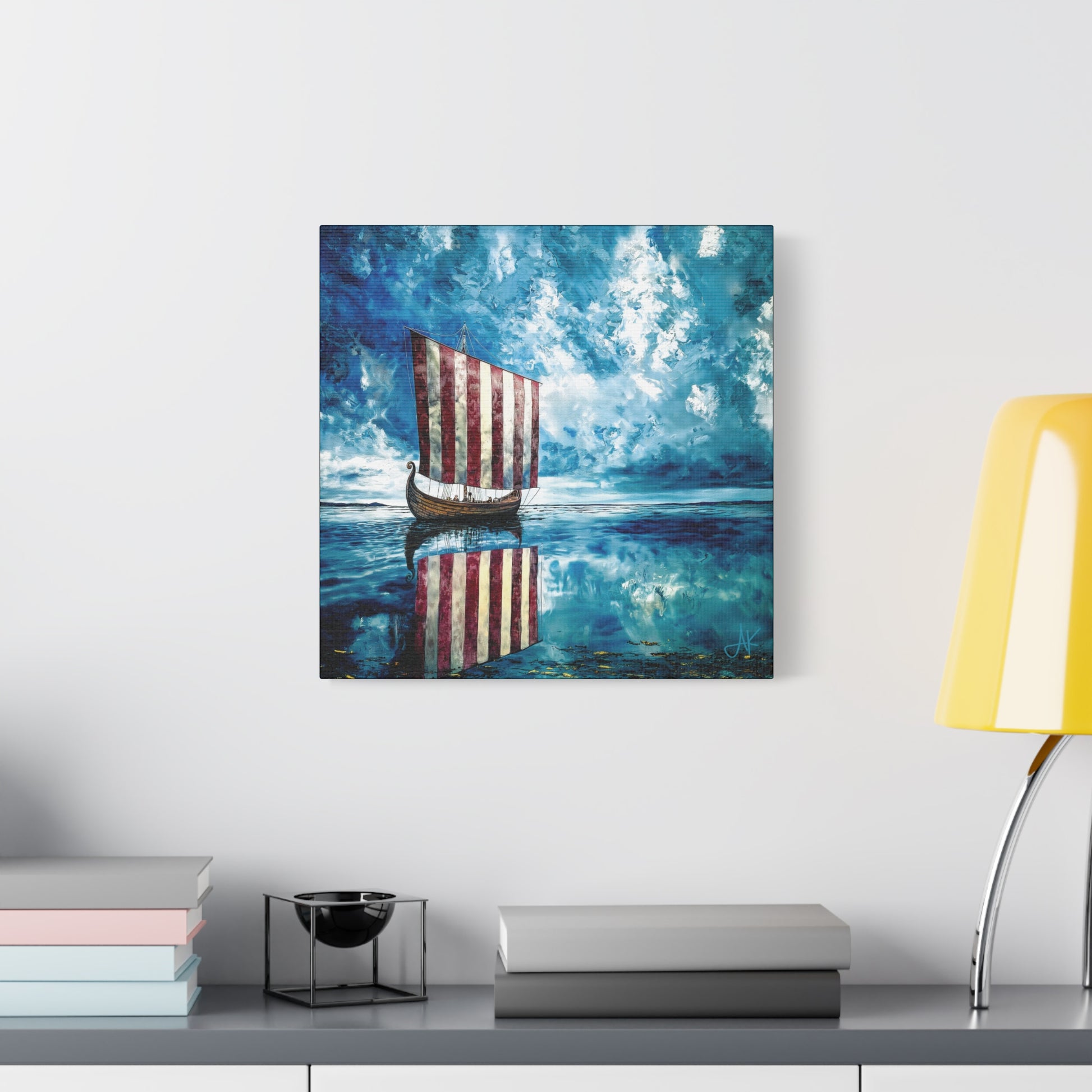 A lone Norse longship moves across glass-still Hebridean waters, its red-and-cream sail rising like a banner against a towering blue sky. The reflection below doubles the sail into a quiet herald’s flag, turning sea and sky into a single field of colour and light. This square fine art canvas holds the room the way a story holds attention—calm on the surface, charged underneath.