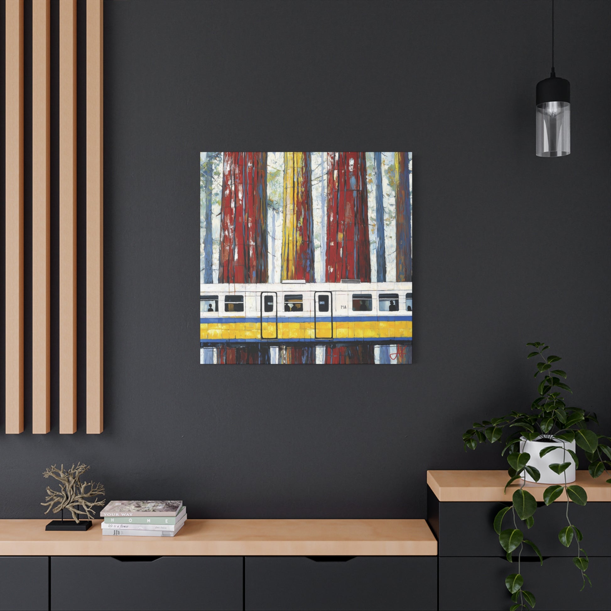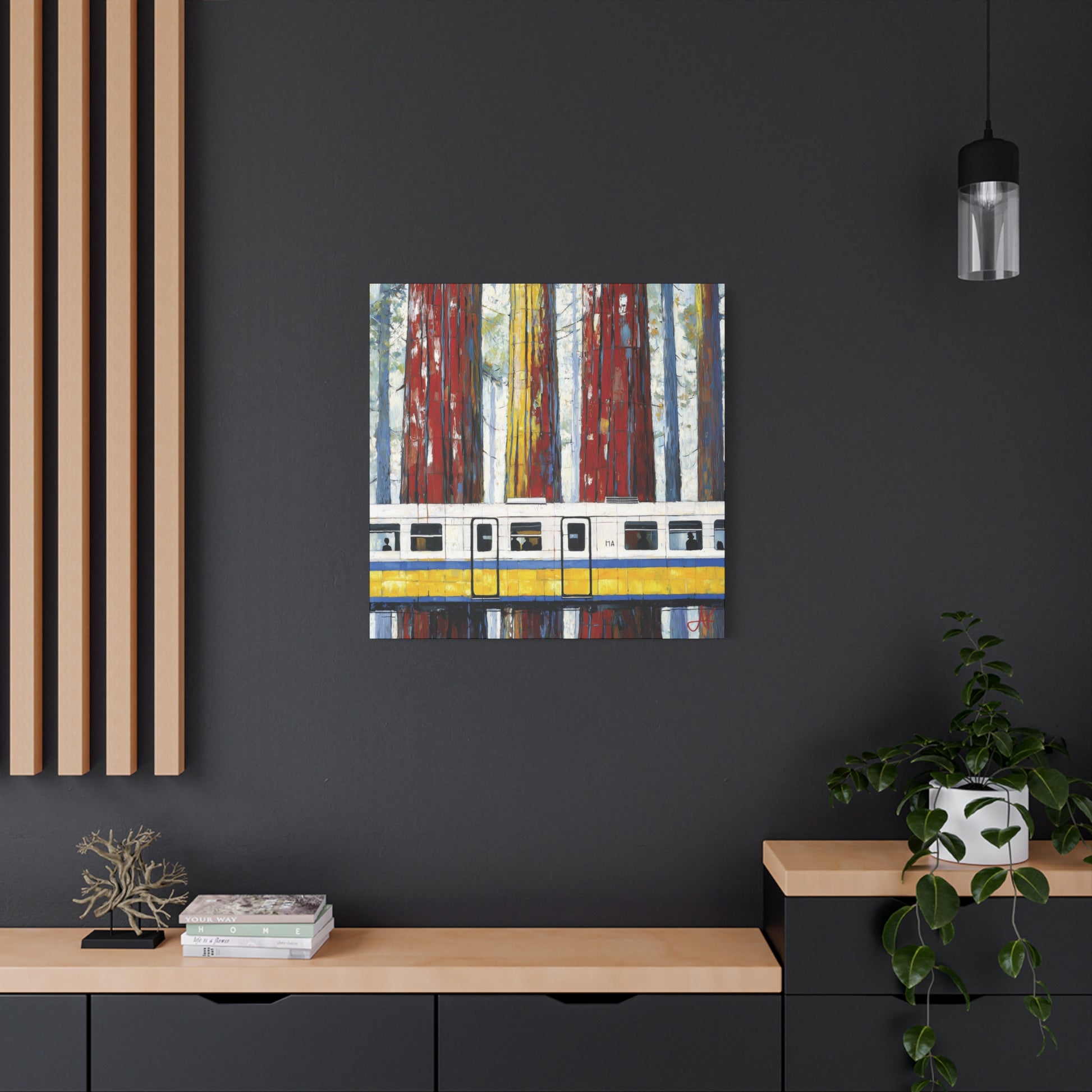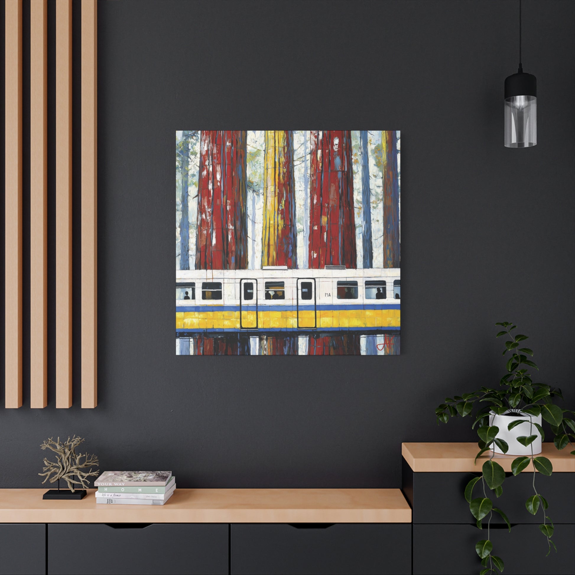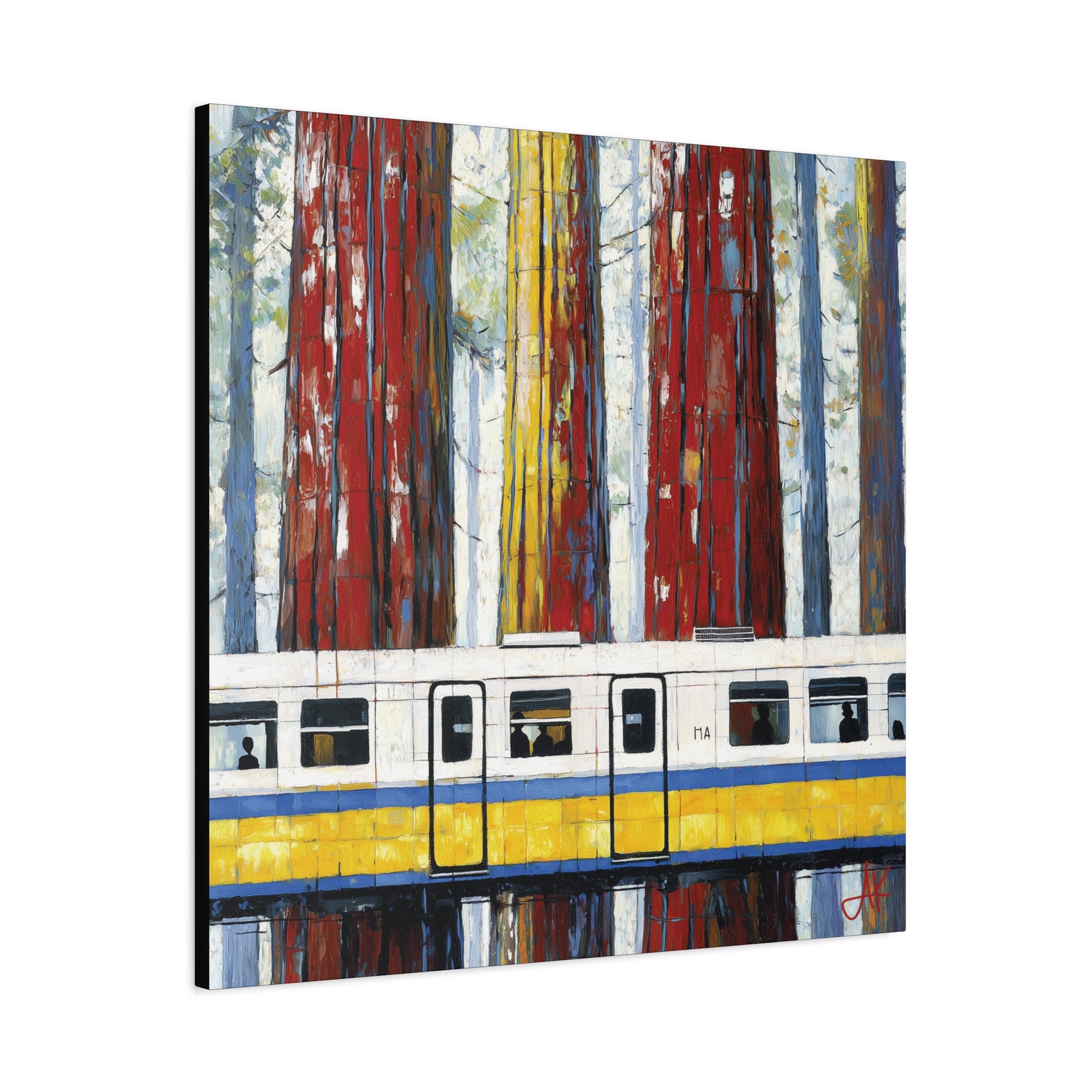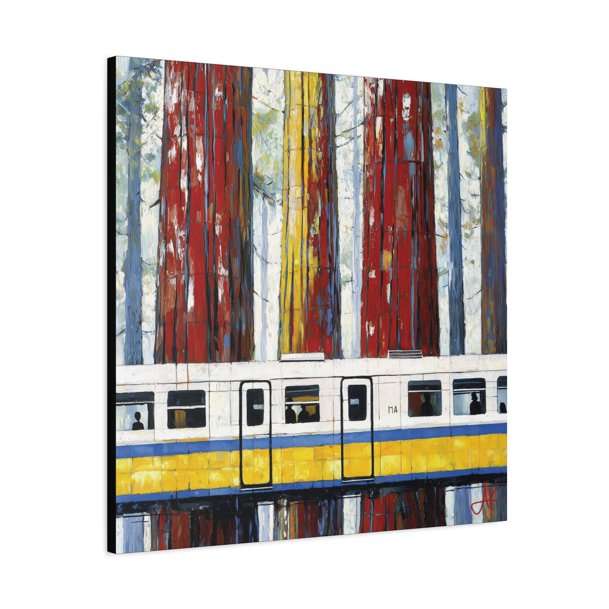 Stylistically, the piece sits between contemporary abstraction and graphic illustration. The trunks are rendered with heavy impasto blocks and visible knife marks, while the train band remains crisp and almost diagrammatic, reading clearly from across the room. On the wall, this square canvas works as a focal statement in living rooms, offices, studios, and reception spaces—anywhere a single artwork can add colour, structure, and a quietly provocative question about the direction of modern life.