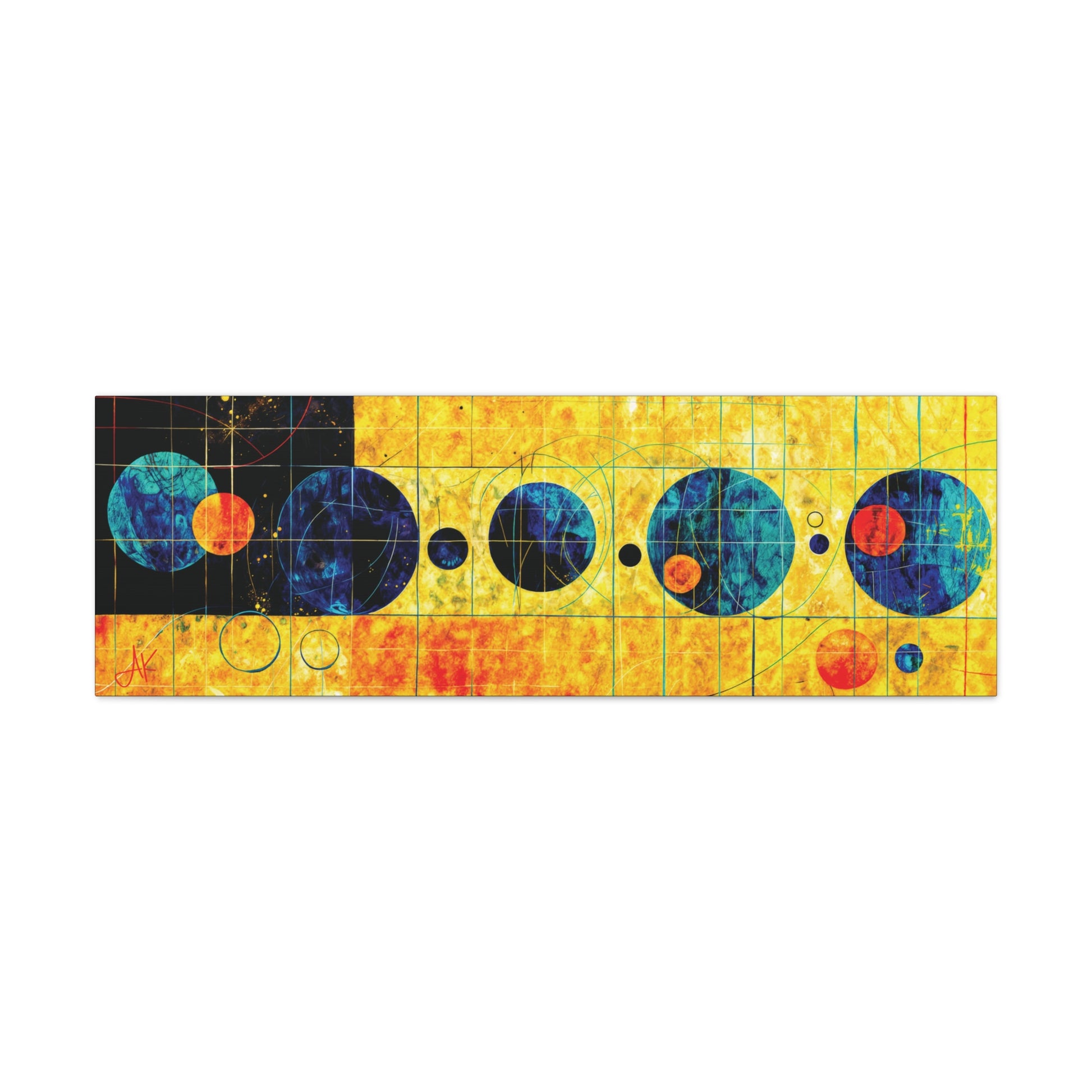 Stylistically the piece sits between geometric abstraction and painterly celestial map. The circles are bold and crisp, but their interiors are marbled with layered blues and teals that feel poured and worked like oil paint. The yellow ground breaks into clouds, fractures, and flecks of colour, recalling expressive modern painting, while the grid and arcs impose a quiet order over the surface. From across the room it reads as a clean, graphic sequence of planets; up close, the surface resolves into intricate textures, colour veining, and small incidents of splatter that reward slow looking.