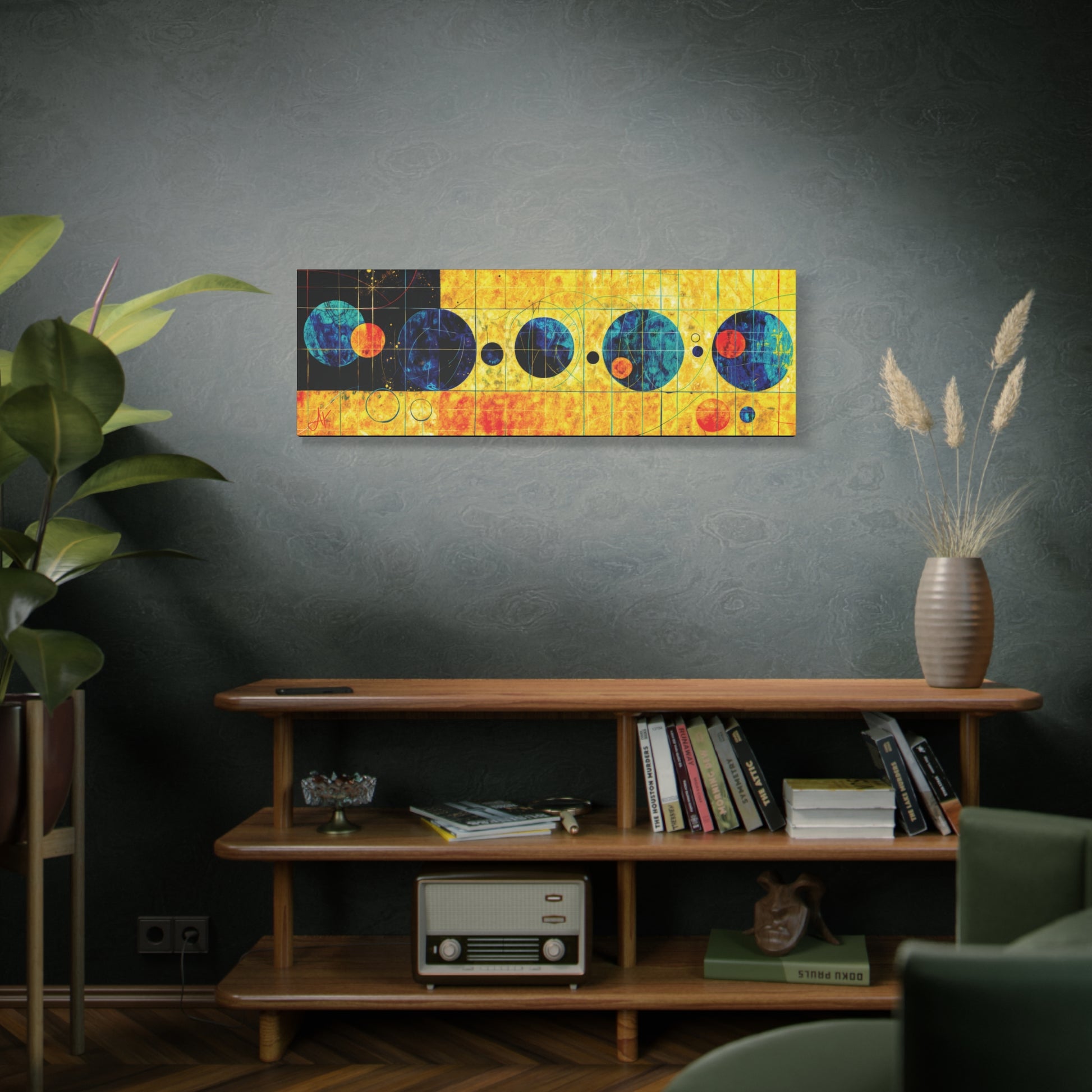 With its long, panoramic format, this canvas is designed as a horizontal statement piece. It works beautifully over a sofa, above a sideboard, along a dining room wall, or in a study or home office where science, faith, and curiosity sit side by side. In family spaces it becomes a visual prompt for questions about space and time; in more contemplative rooms it settles into a steady reminder that our lives unfold inside a much larger, carefully ordered journey.