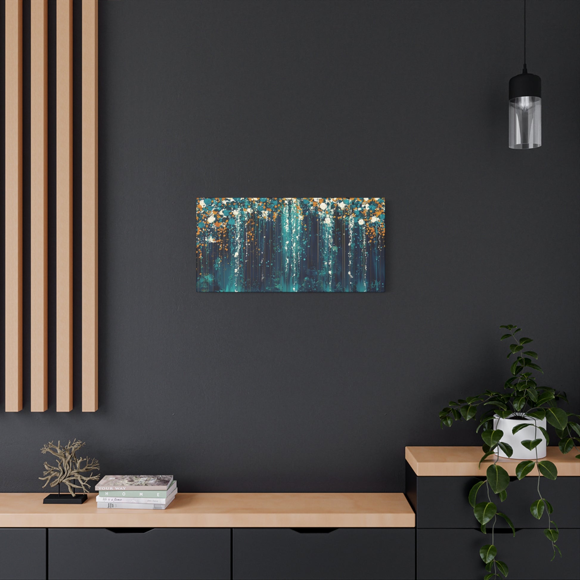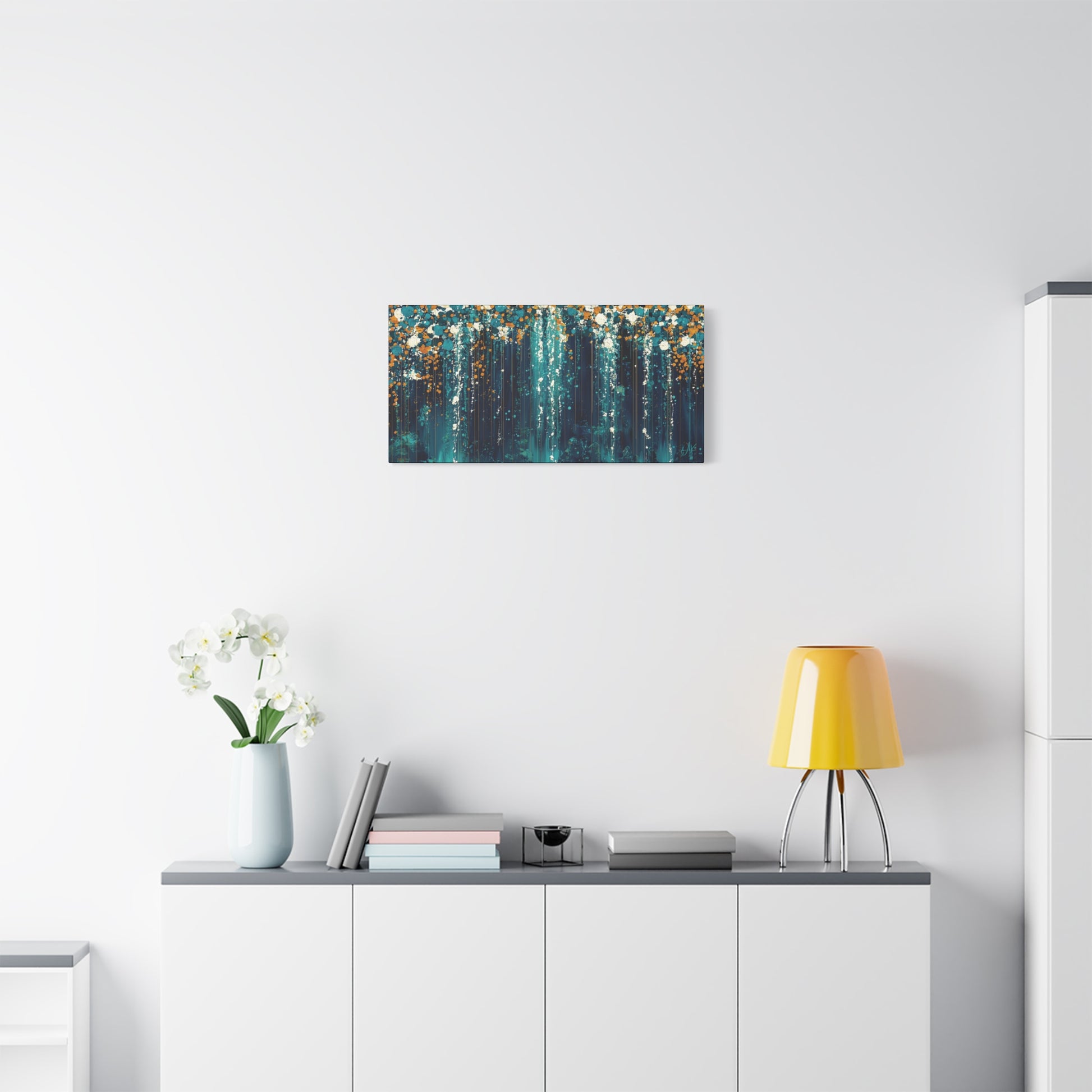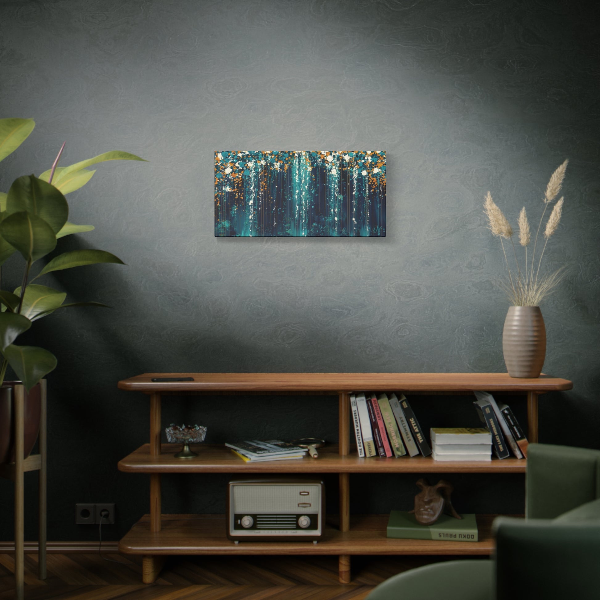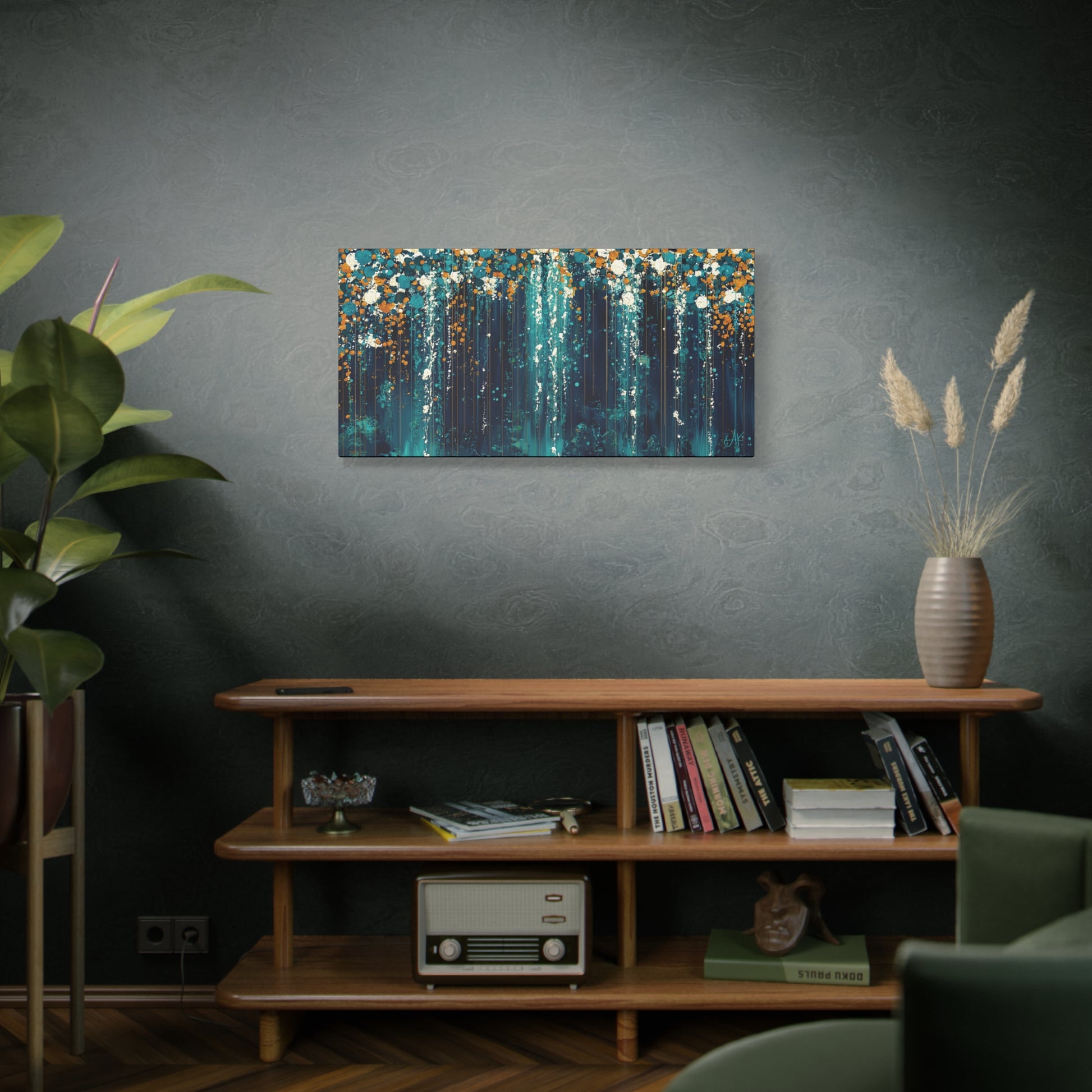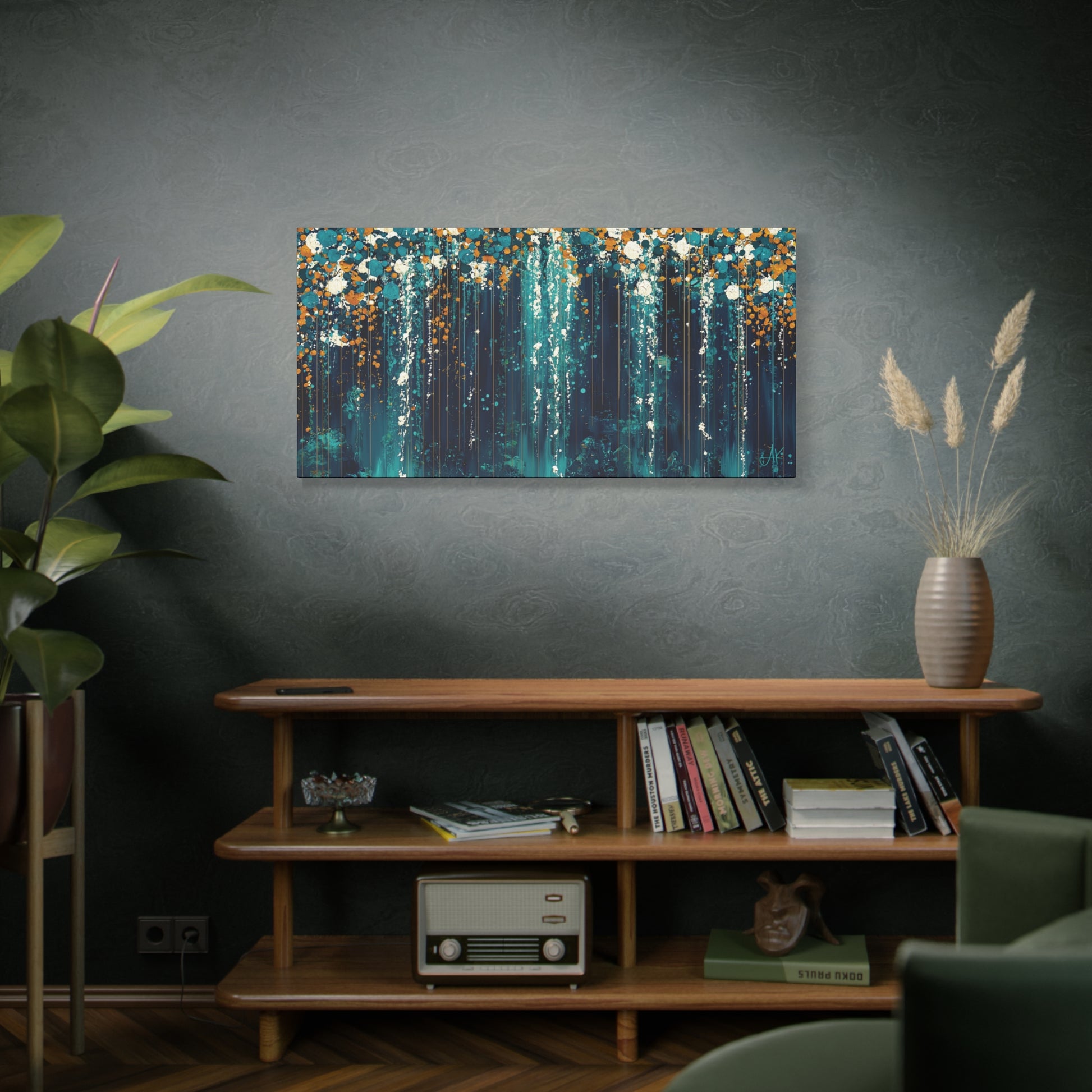 On the wall, Kells in the Deep reads like a panoramic window into Atlantic depth. On light walls it feels crisp and contemporary, with the blues and teals giving clean structure while the gold brings lift and warmth. On charcoal, deep green, or navy walls, the blues deepen and the gilded fall-lines become richer and more atmospheric, which suits studies, prayer corners, reading rooms, and calm bedrooms. The 2:1 panoramic format makes it a strong centrepiece over a sofa, sideboard, or bed, and it works beautifully in long hallways, reception areas, and executive spaces where the horizontal sweep can breathe.