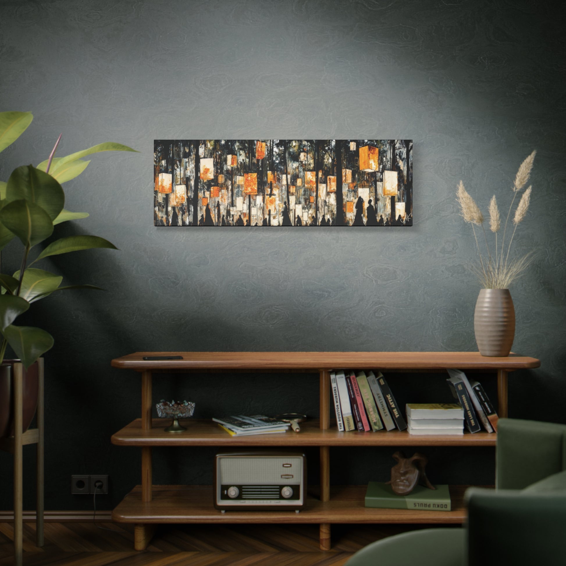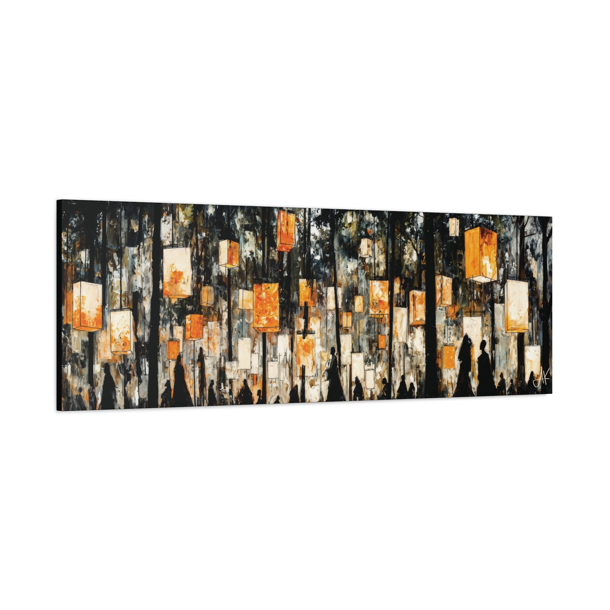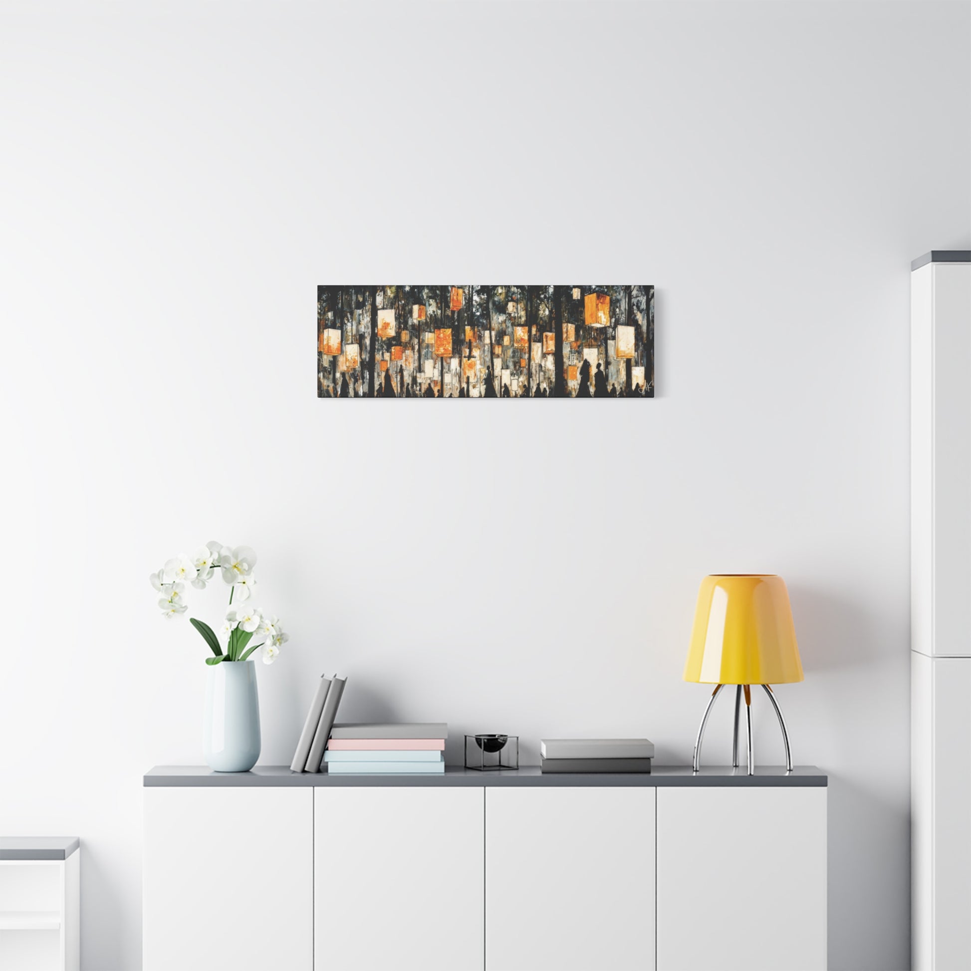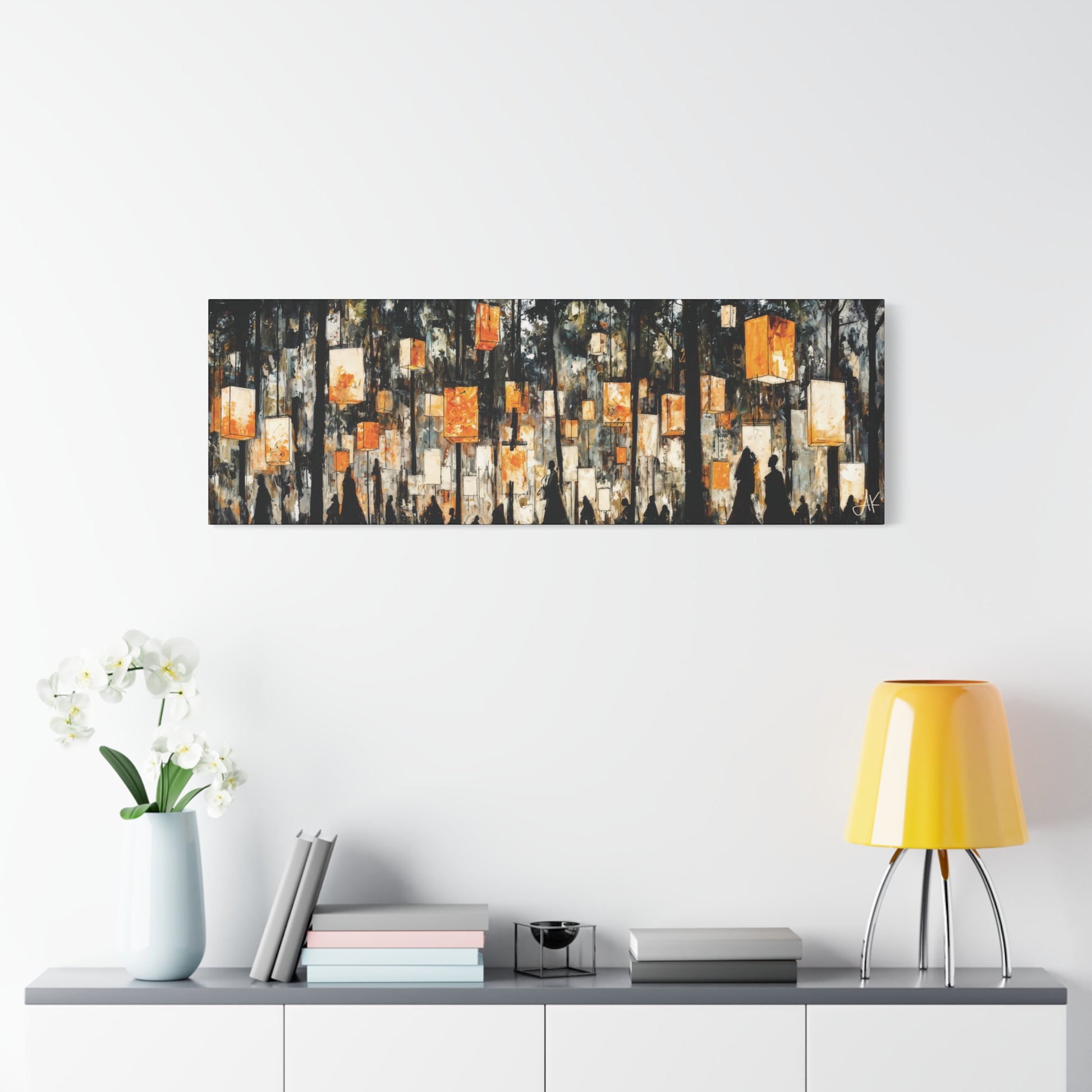 With its long, horizontal sweep, Lantern Festival is designed for large spaces that call for a single, cohesive statement: above a sofa, along a dining wall, anchoring an office reception, or stretching the length of a corridor. It brings warmth without overpowering the room — a secular, quietly atmospheric piece that rewards repeated viewing as the light in your own space shifts throughout the day and evening.