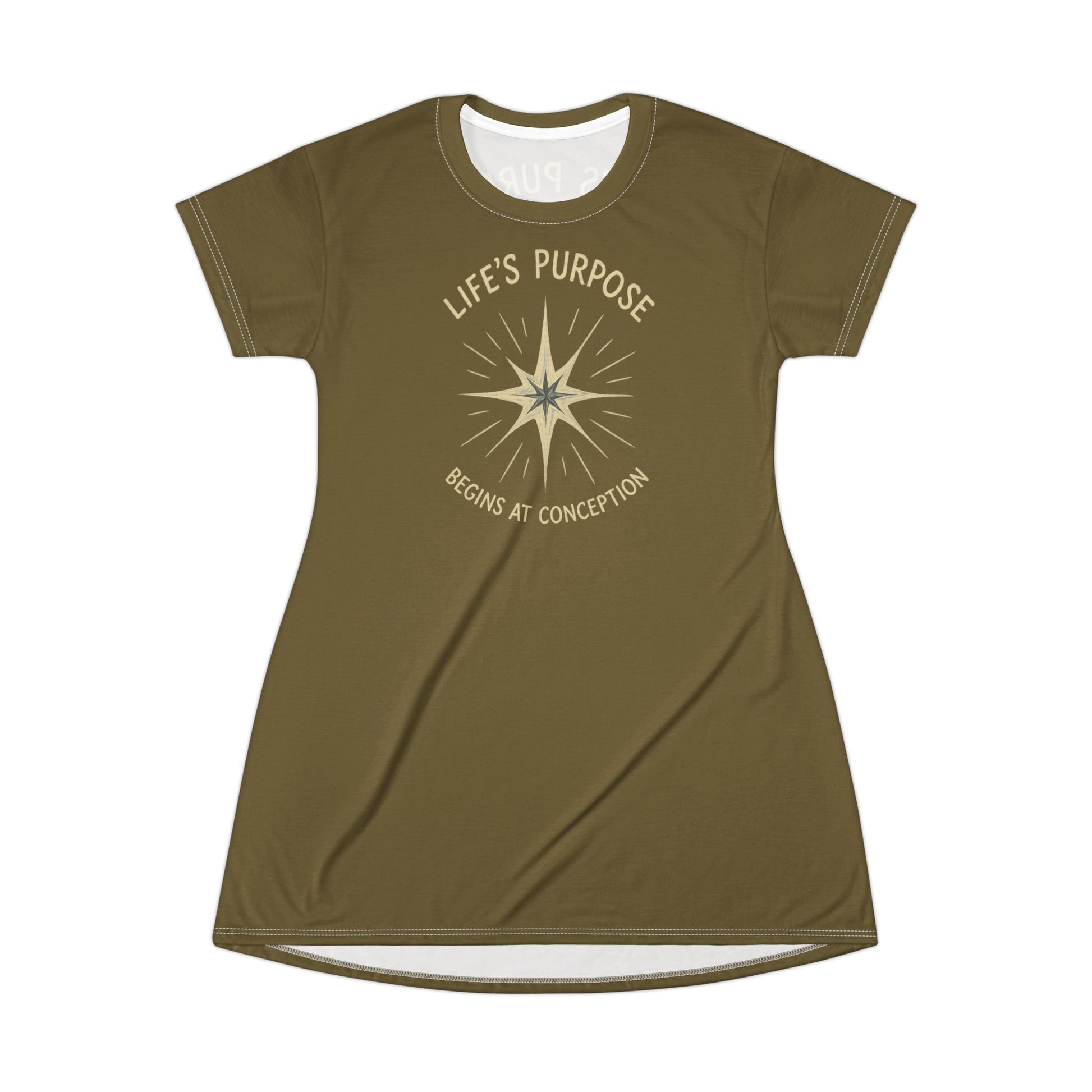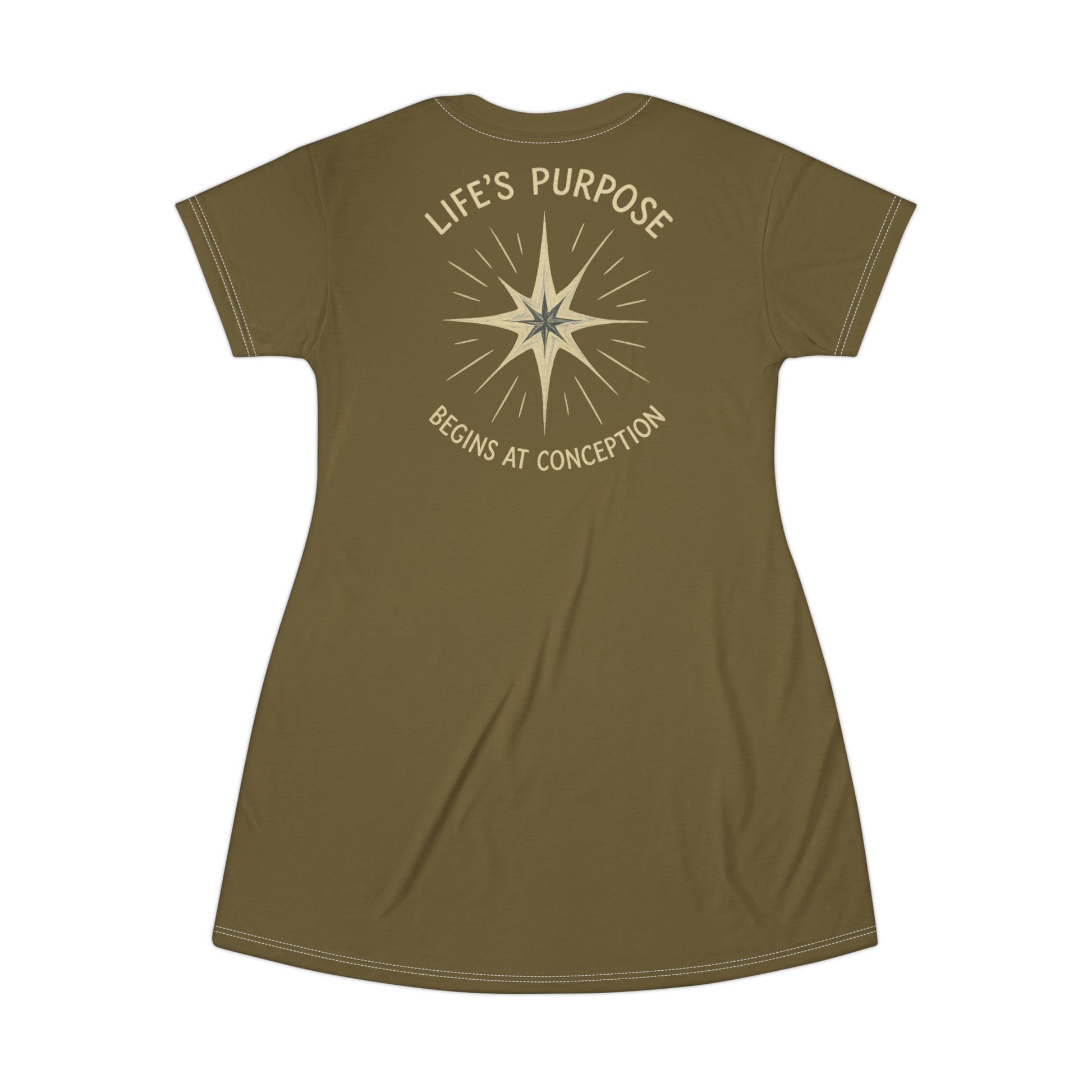 "Life's Purpose Begins at Conception #02", T-Shirt Dress (Bogbrush Olive)