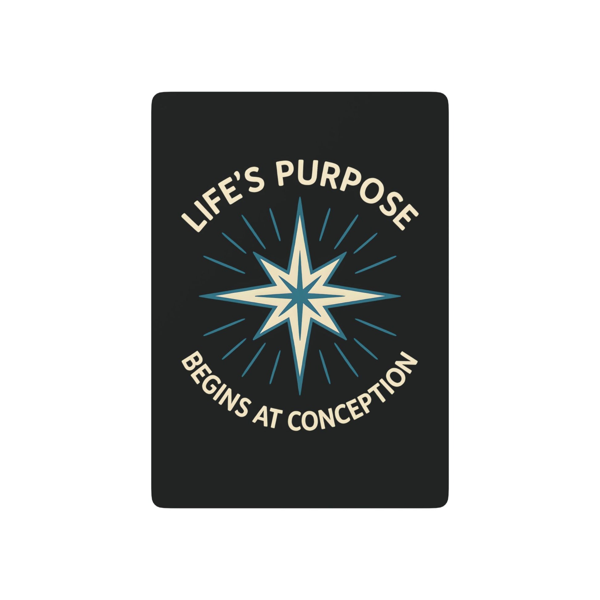Bring clarity to the table. This deck carries our Life's Purpose starburst crest—an emblem of the first spark of life—set in warm cream and cool blue on deep black. It’s a quiet, confident pro-life statement that holds its own at family night, youth group, or the campsite.