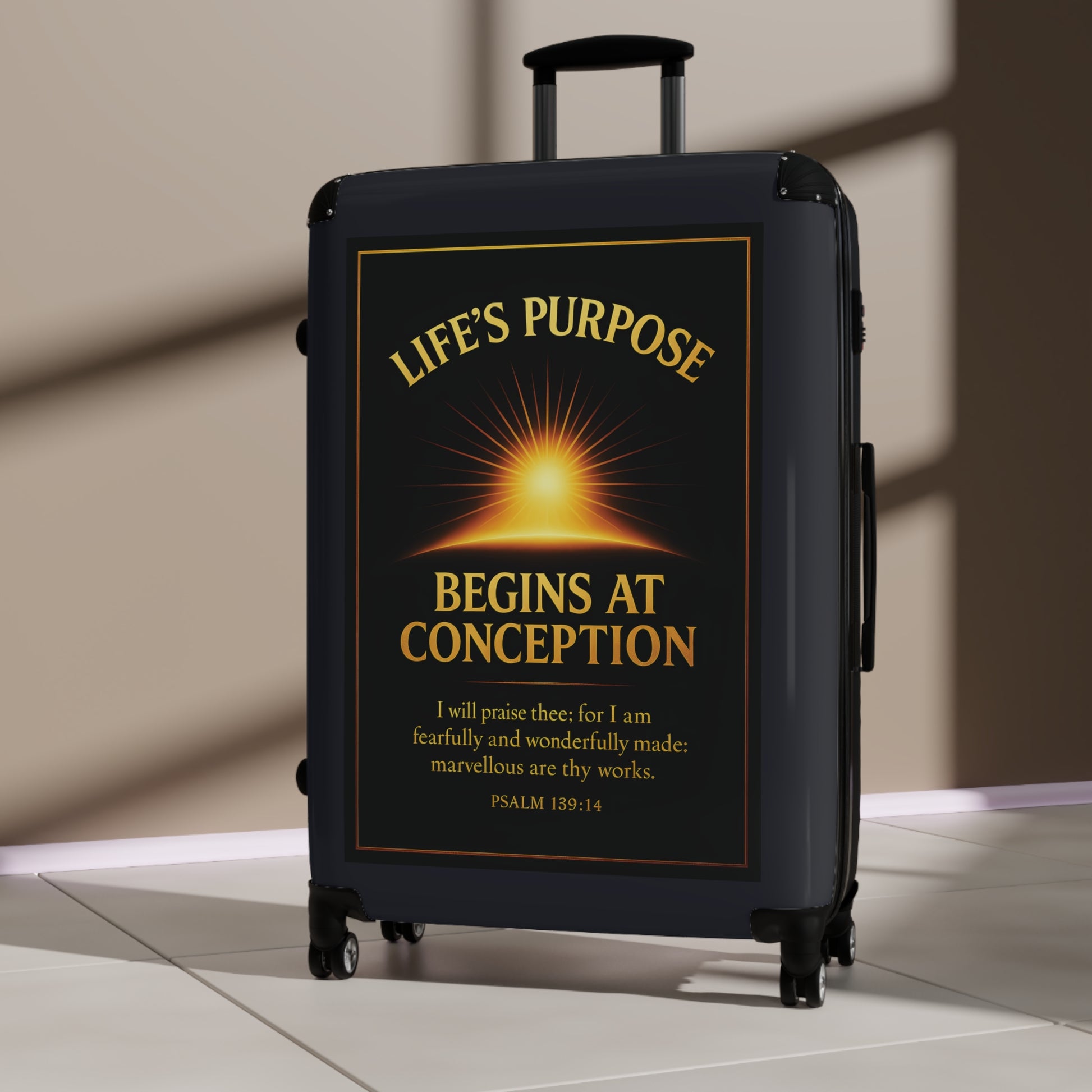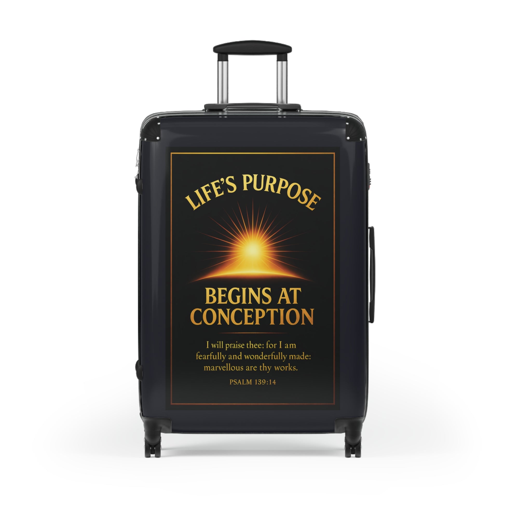 Carry a clear witness wherever you roam. This hard-shell suitcase features our gold-on-black “Life’s Purpose Begins at Conception” sunrise artwork with Psalm 139:14 set beneath—“I will praise thee; for I am fearfully and wonderfully made…” It’s a refined, quietly bold piece of luggage that stands out on the carousel and stands for something on the journey.