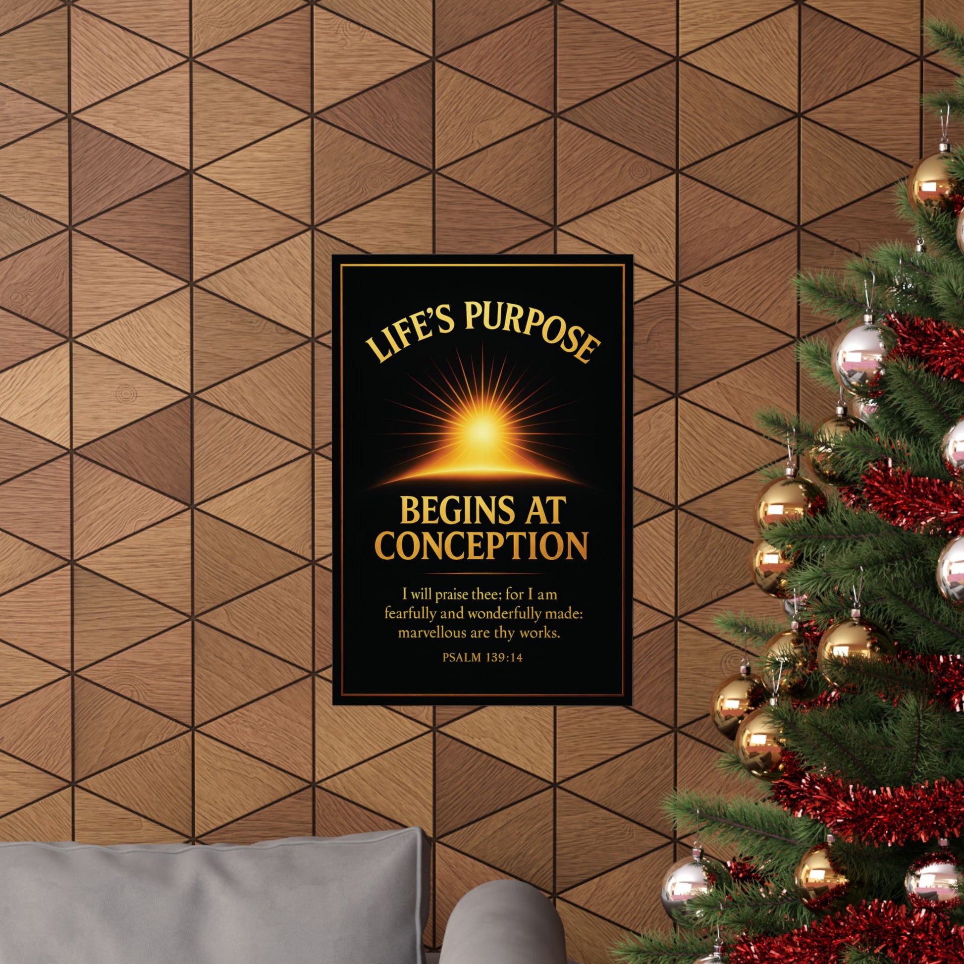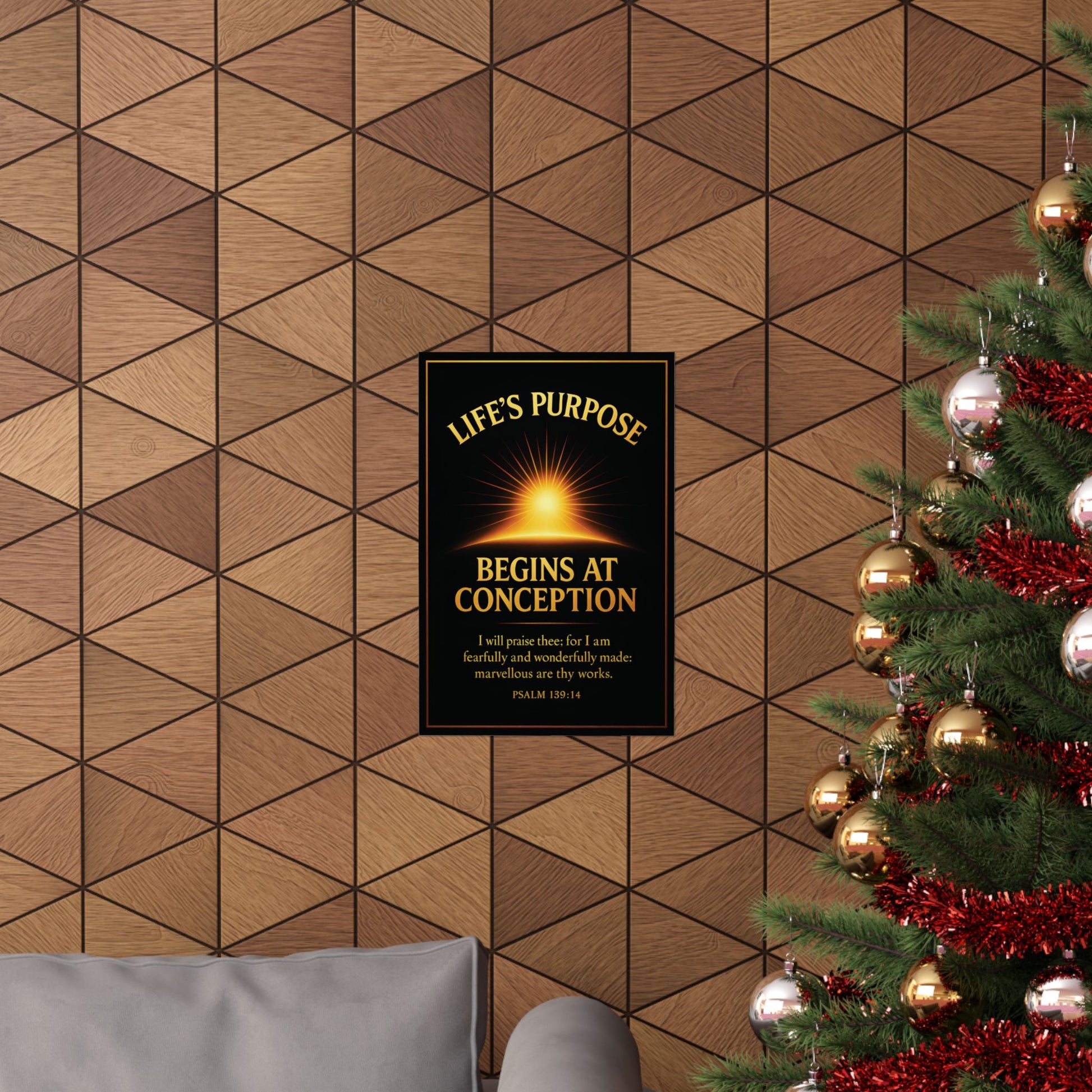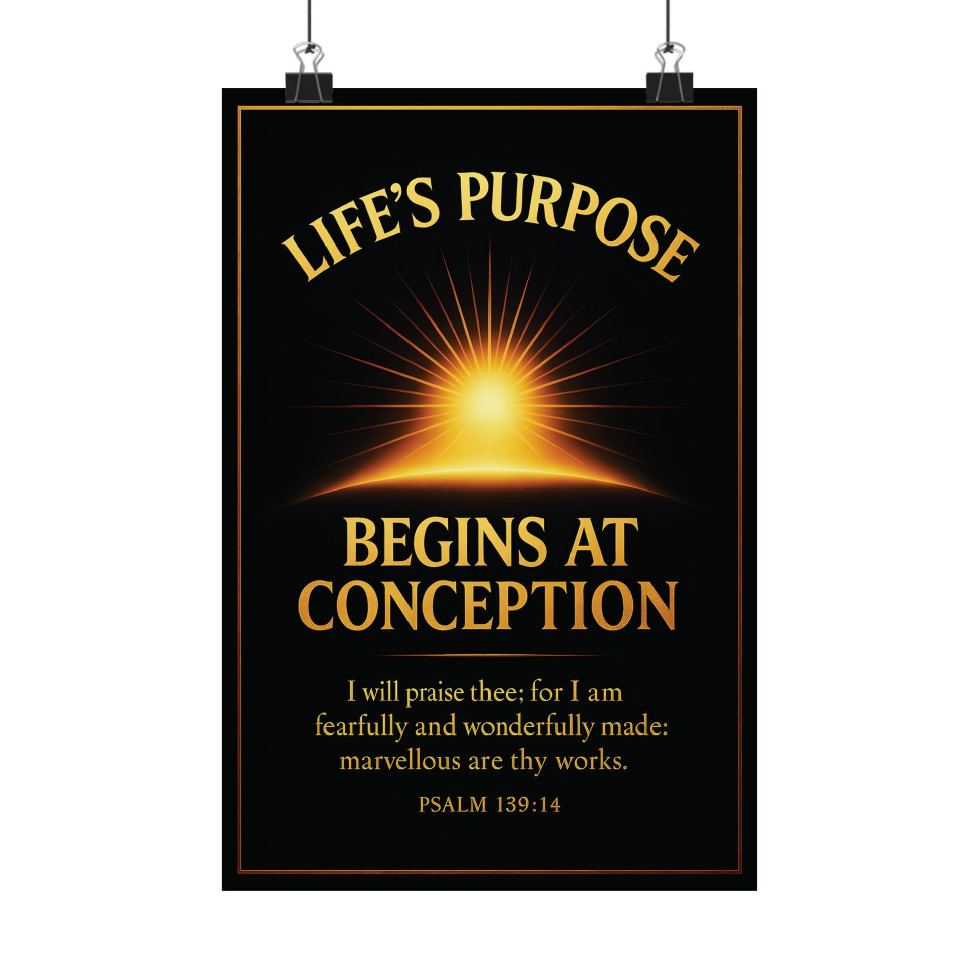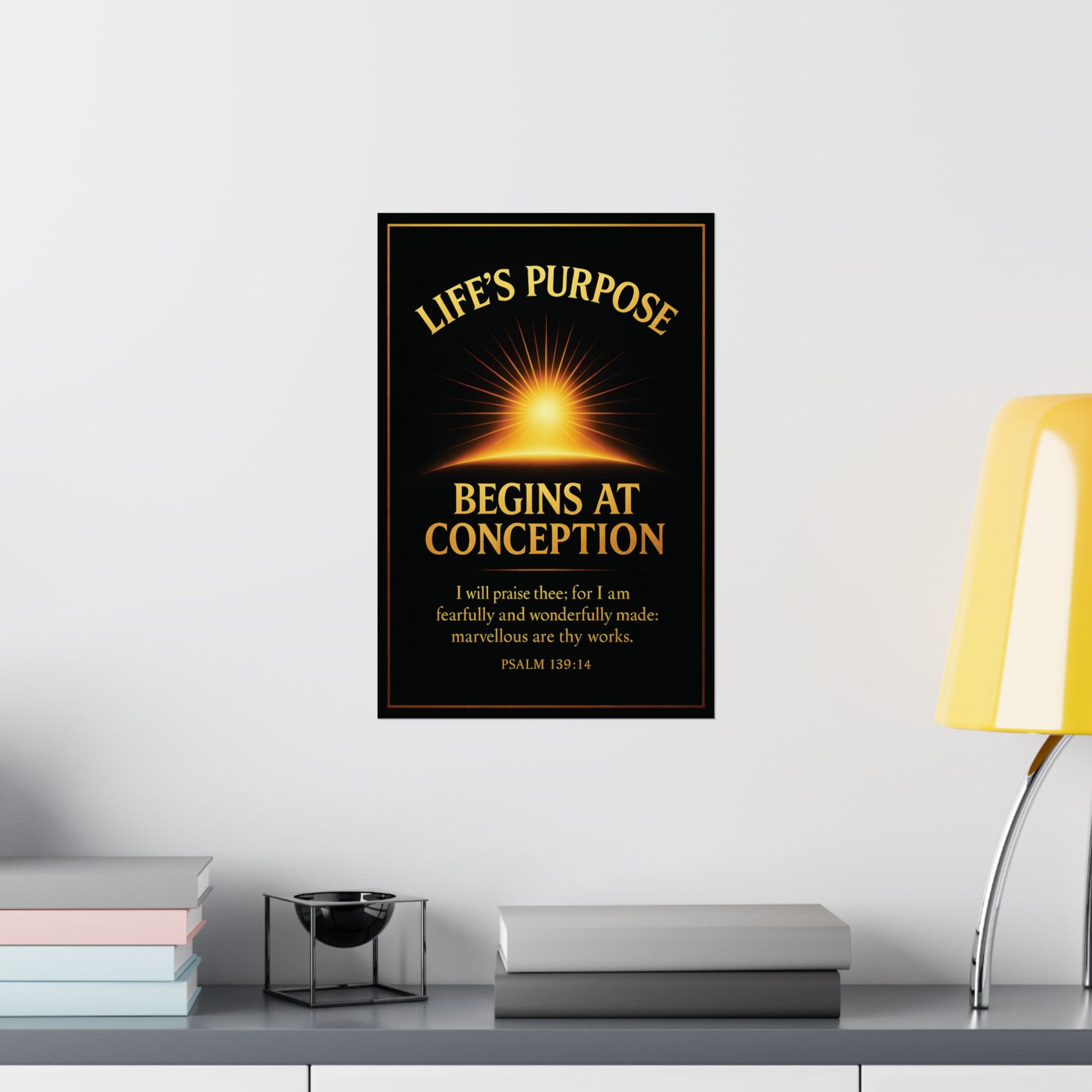 A luminous proclamation of hope and human dignity. This fine-art poster sets a radiant sunrise above the words BEGINS AT CONCEPTION, crowned by LIFE’S PURPOSE and grounded with Psalm 139:14: “I will praise thee; for I am fearfully and wonderfully made: marvellous are thy works.” The result feels like a reverent, vintage broadside—quietly bold, beautifully composed.
