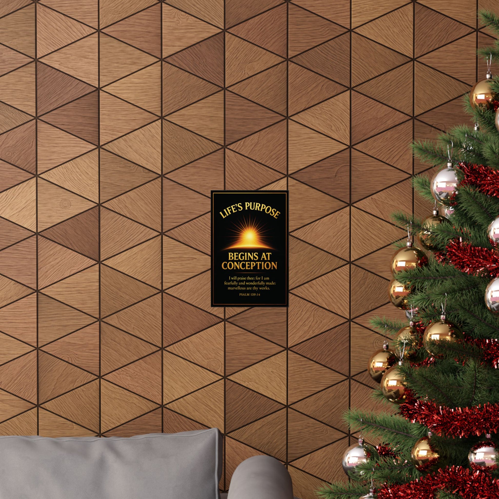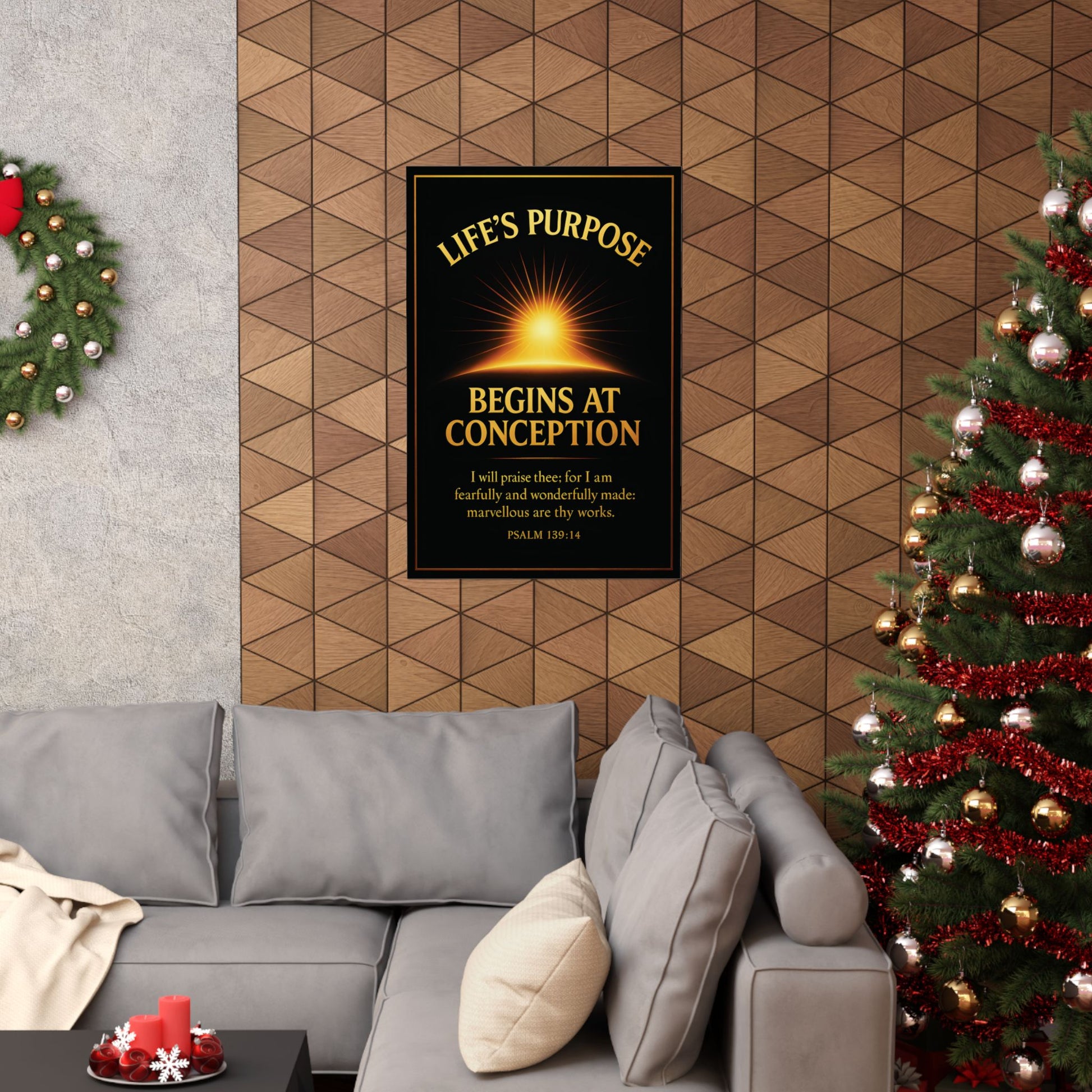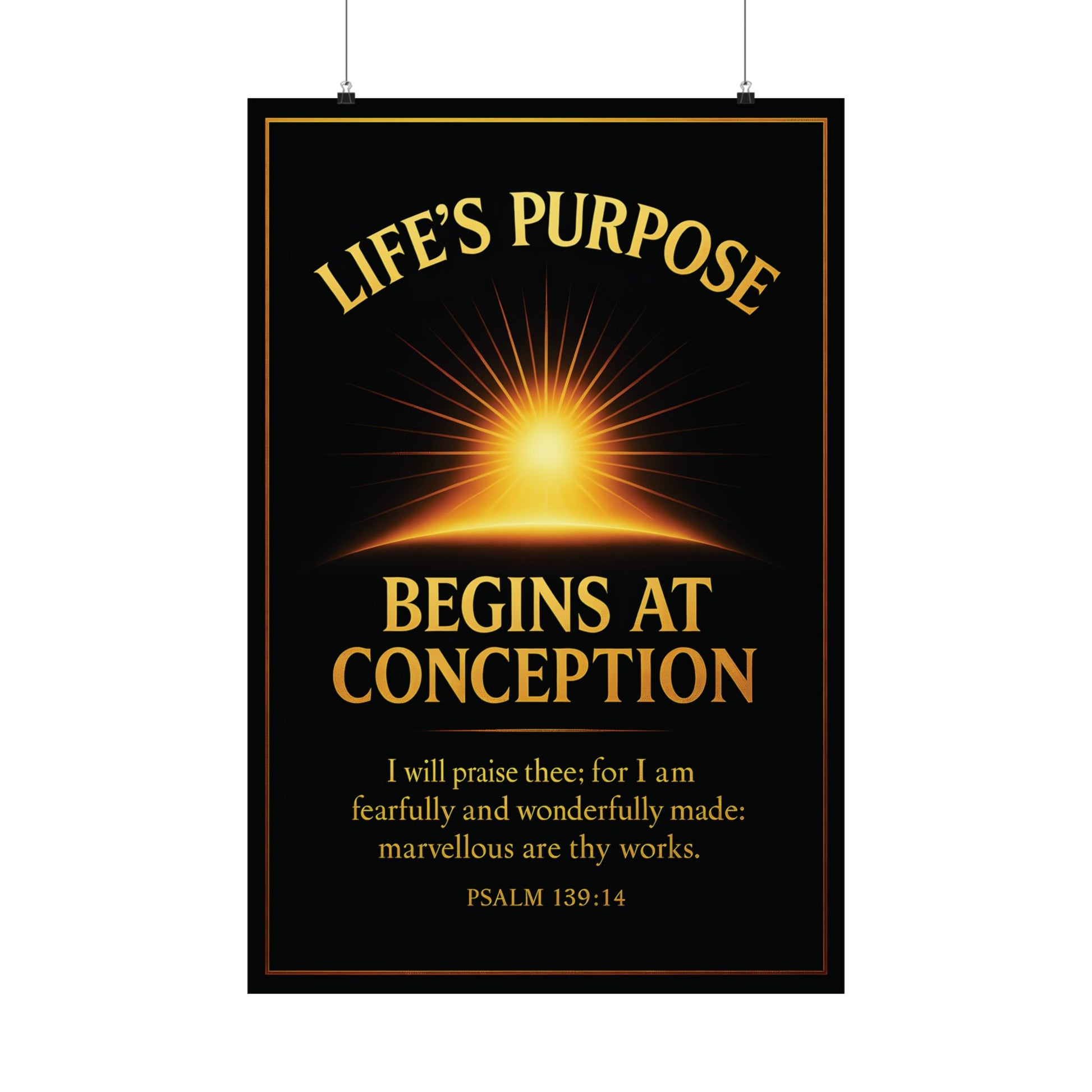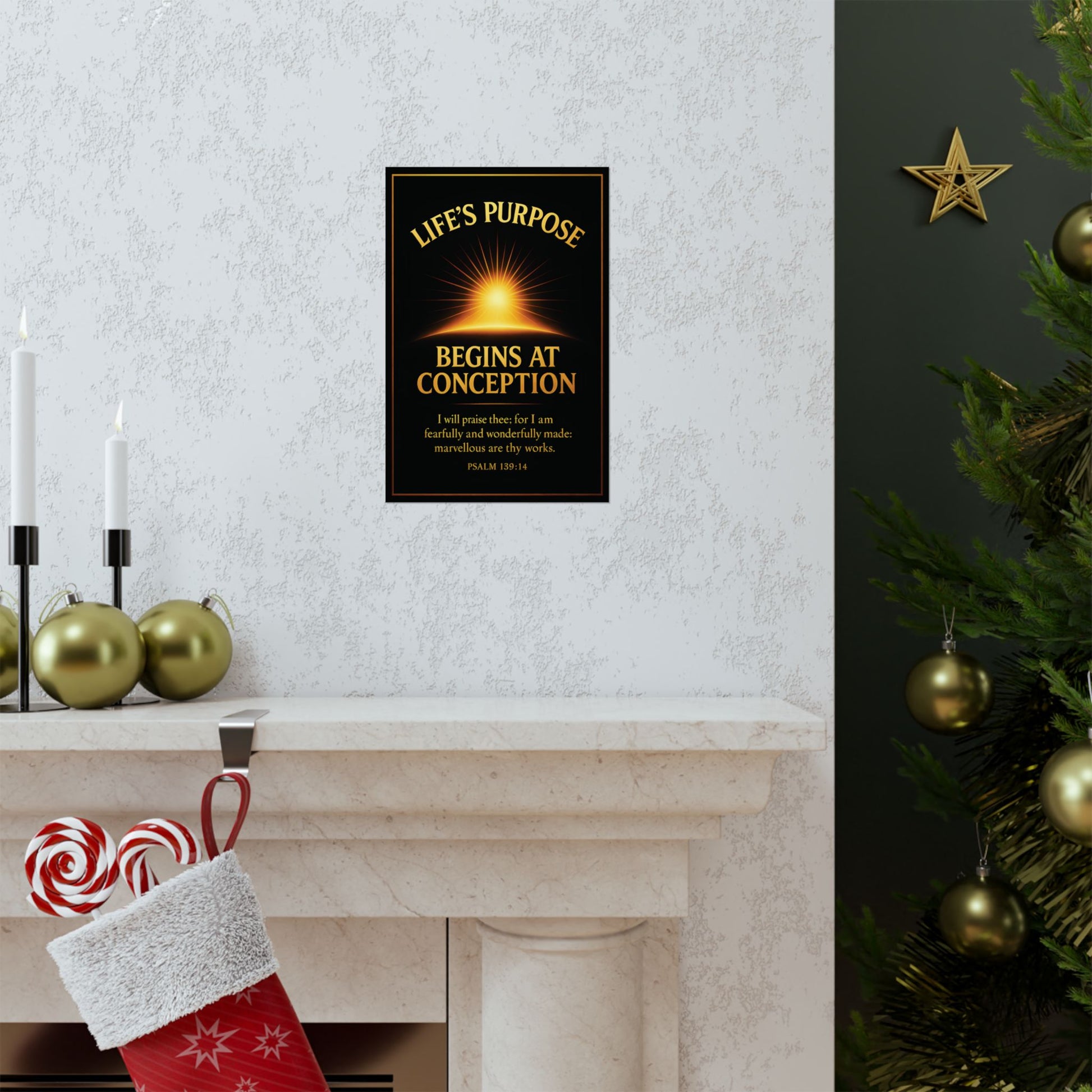 A luminous proclamation of hope and human dignity. This fine-art poster sets a radiant sunrise above the words BEGINS AT CONCEPTION, crowned by LIFE’S PURPOSE and grounded with Psalm 139:14: “I will praise thee; for I am fearfully and wonderfully made: marvellous are thy works.” The result feels like a reverent, vintage broadside—quietly bold, beautifully composed.