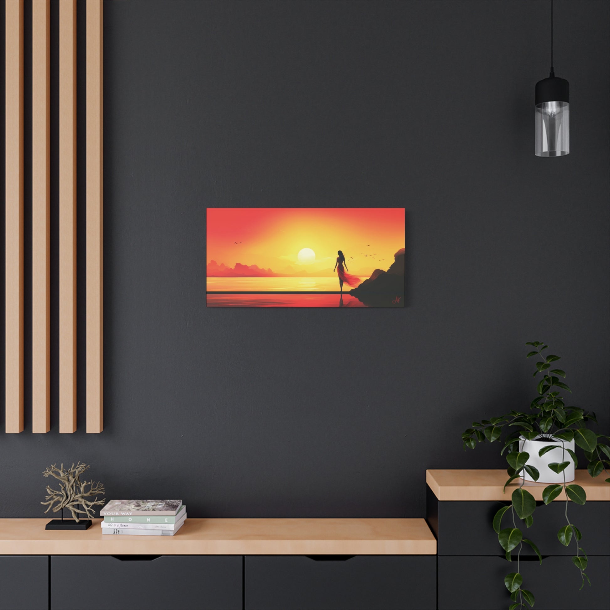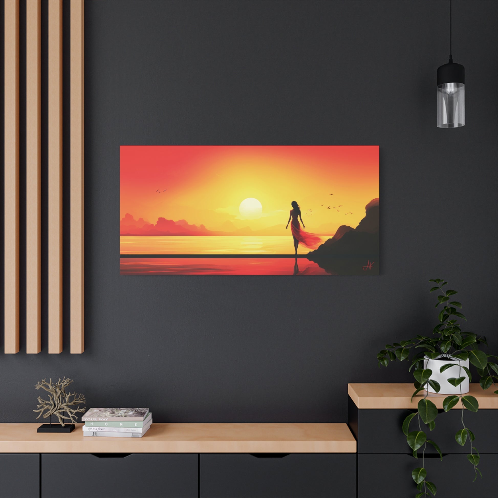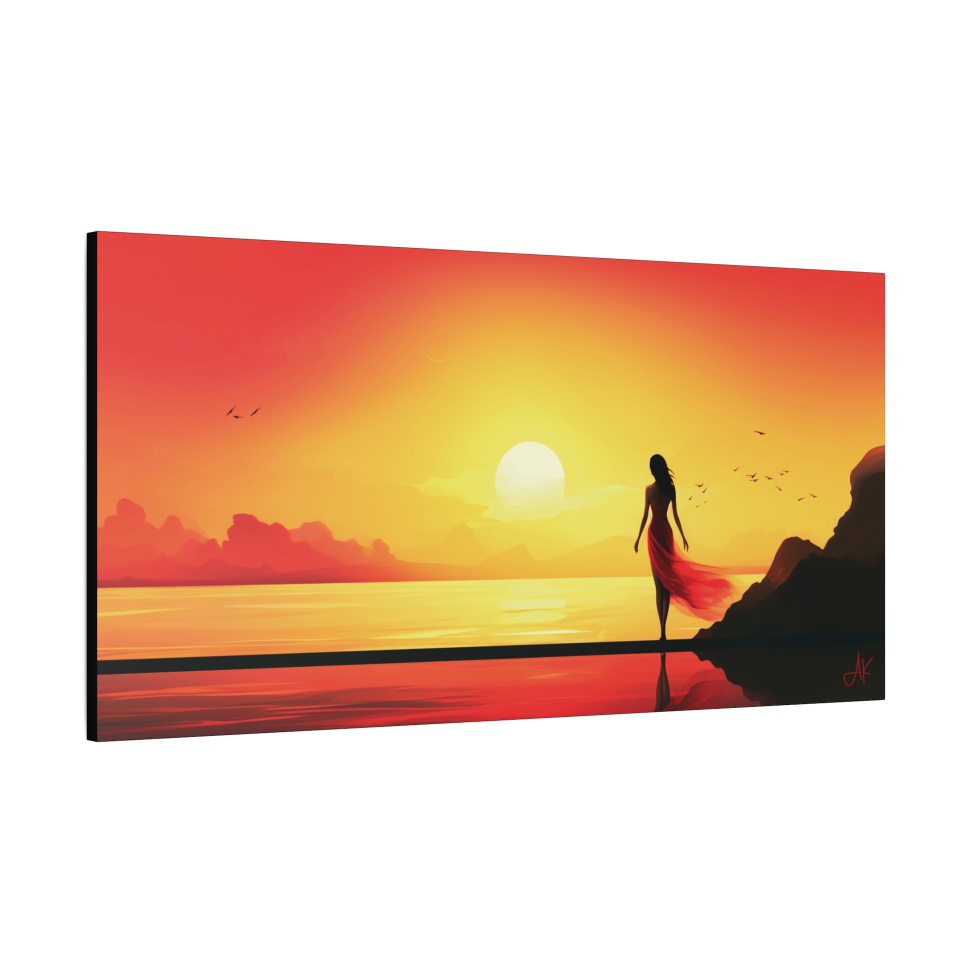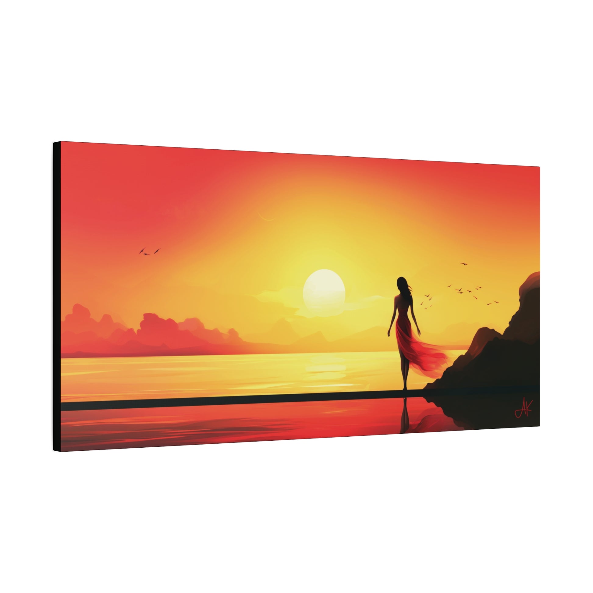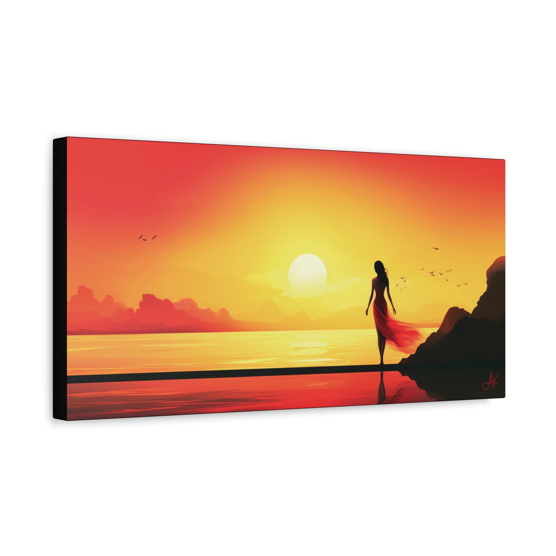 In Longing, a solitary figure stands at the edge of a narrow causeway, her red dress lifting in the evening breeze as she looks out toward a descending sun. The sky moves from deep coral at the top of the canvas through molten orange into a soft, radiant halo around the sun, casting a band of liquid gold across the still water. Below, the reflective strip of crimson at her feet turns the shoreline into a quiet mirror, suggesting both distance and connection between where she stands and where her heart wants to be.