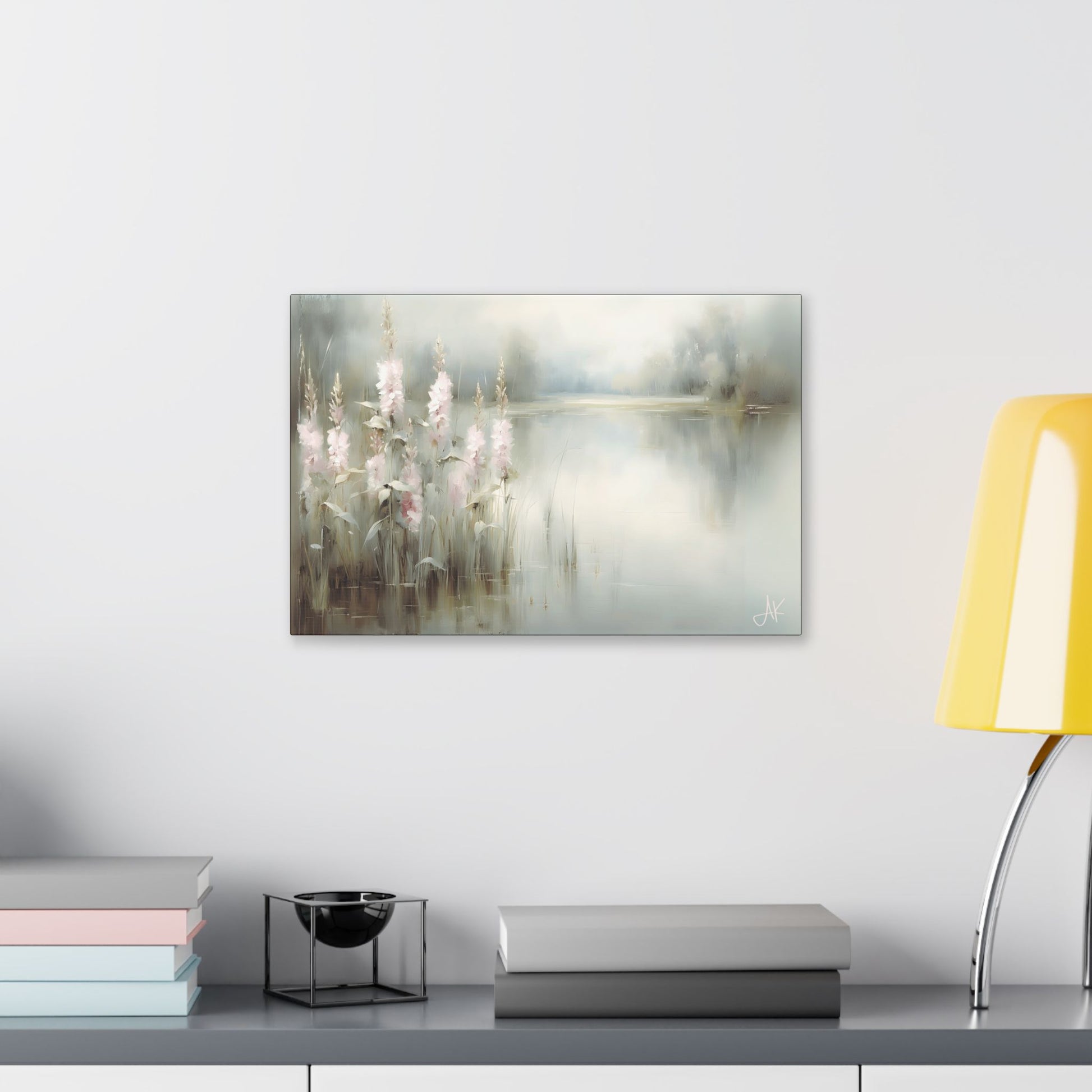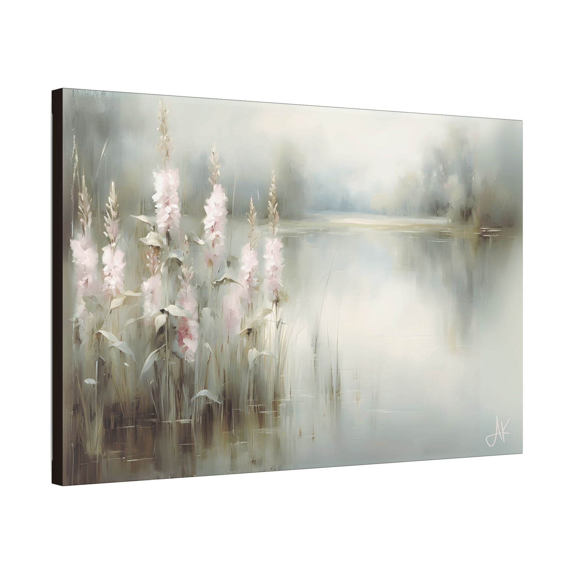 In Pink Rushes, a stand of pale blossoms leans over still water at first light, their soft petals catching what little colour has yet broken through the mist. The lake lies quiet and glassy, reflecting reeds, sky, and distant trees in a single, breath-held surface. Everything is painted in gentle steps of grey-green, cream, and blush, so that the eye moves slowly from flower to water to horizon without ever needing to squint or brace itself.