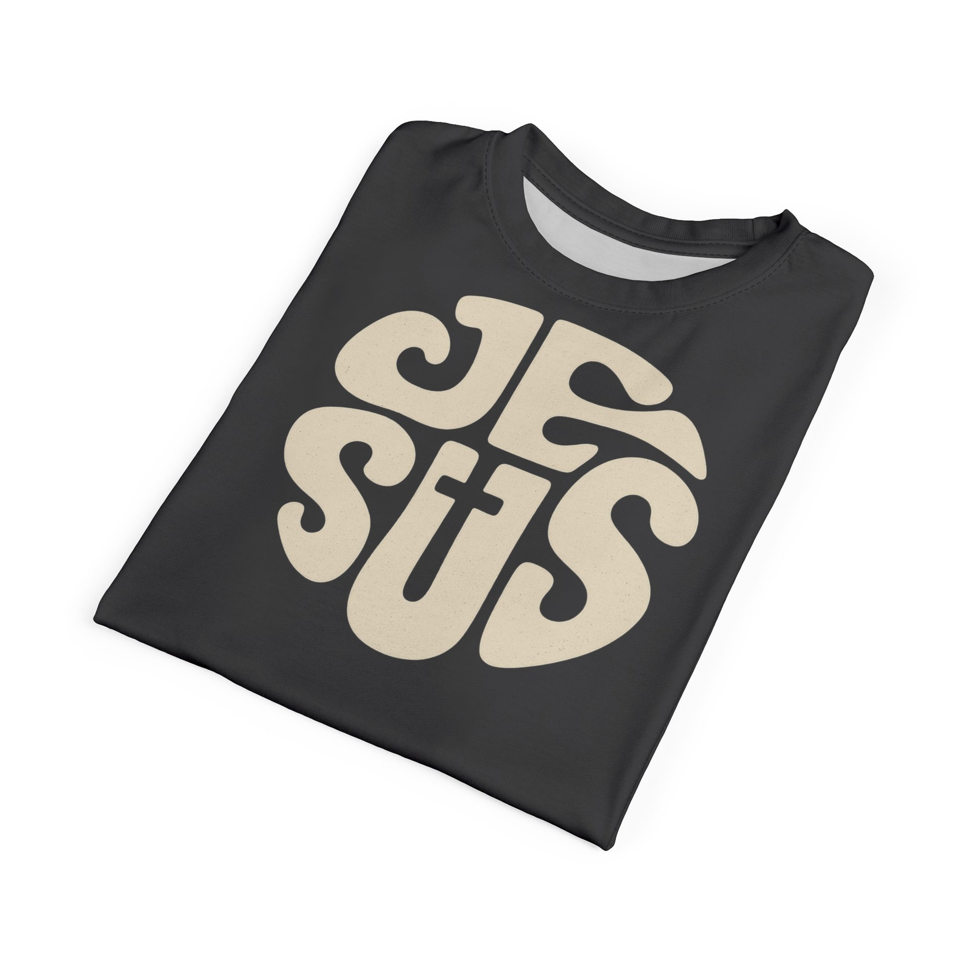 Front: circular 60s/70s groovy logotype spelling JESUS, with a subtle cross cutout in the U