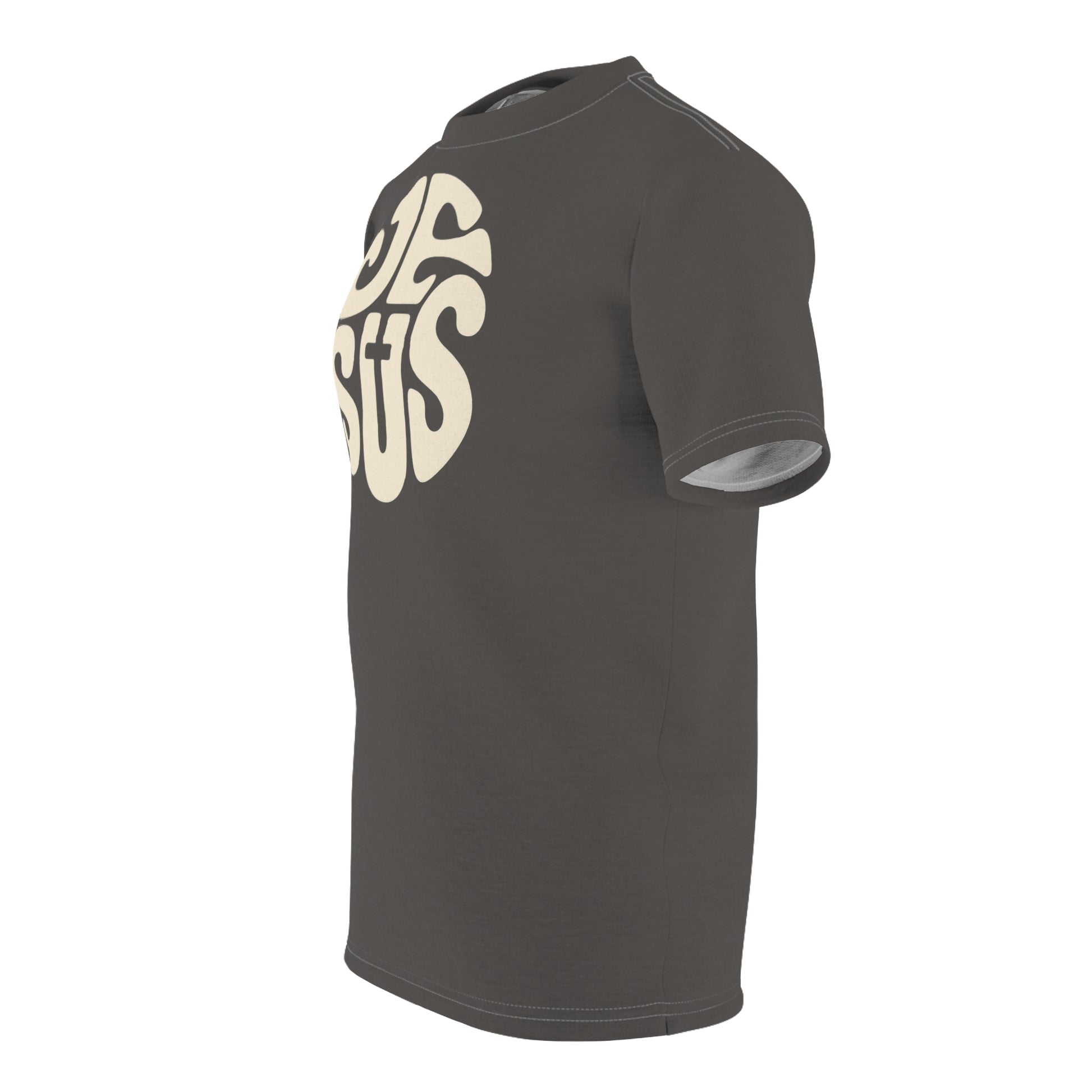 Front: circular 60s/70s groovy logotype spelling JESUS, with a subtle cross cutout in the U