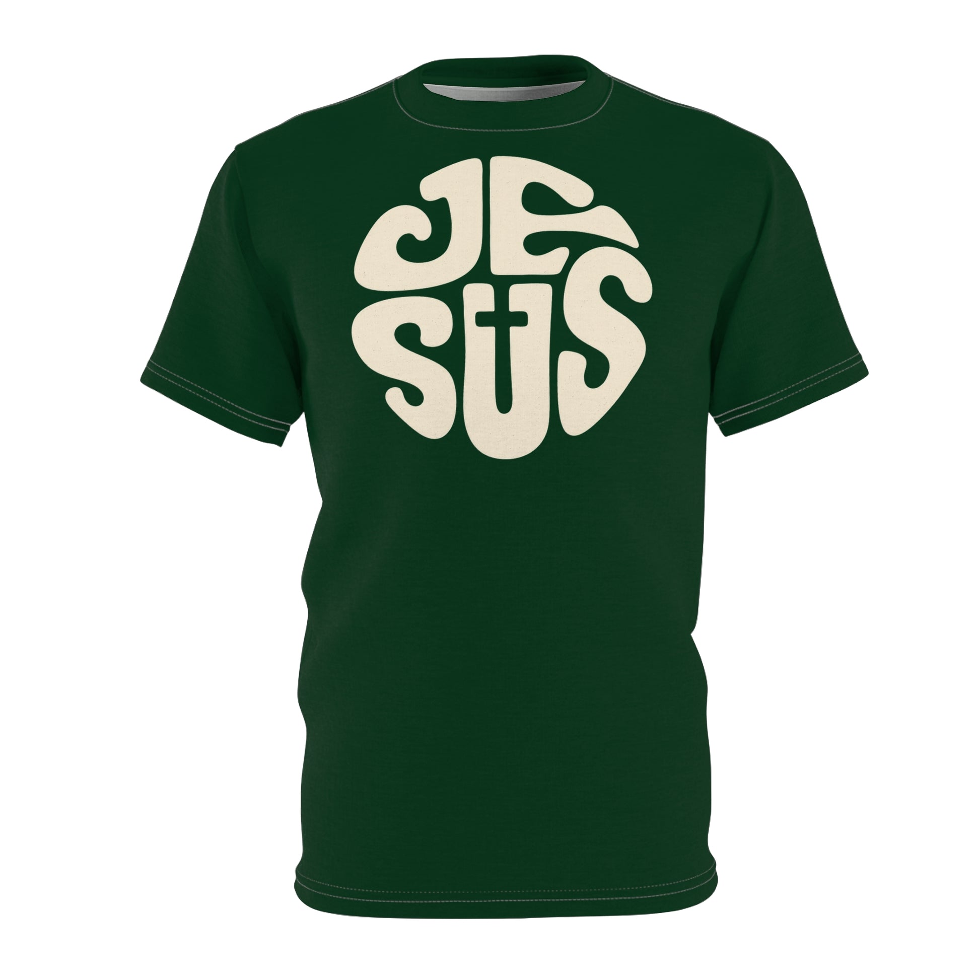 Front: circular 60s/70s groovy logotype spelling JESUS, with a subtle cross cutout in the U
