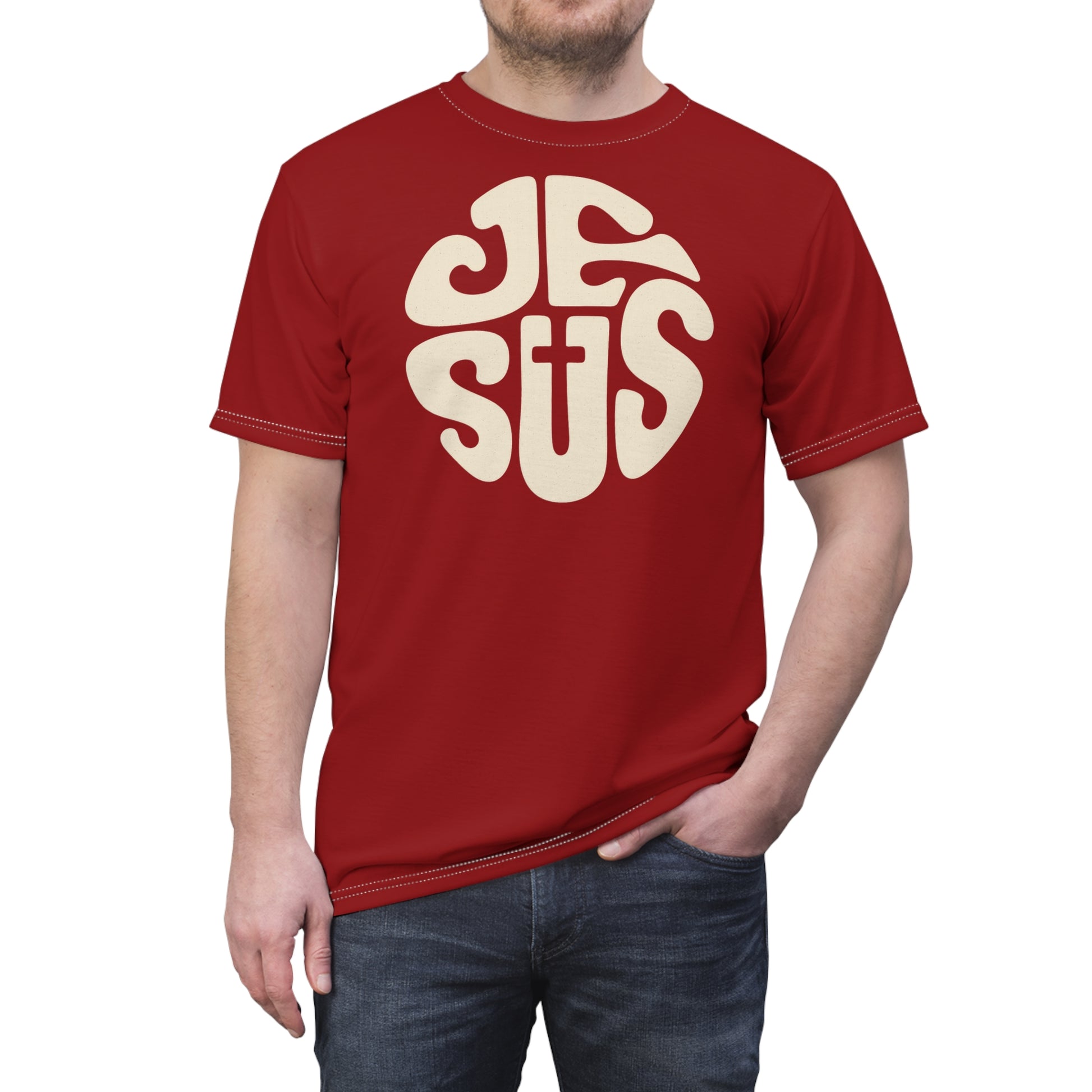 Front: circular 60s/70s groovy logotype spelling JESUS, with a subtle cross cutout in the U