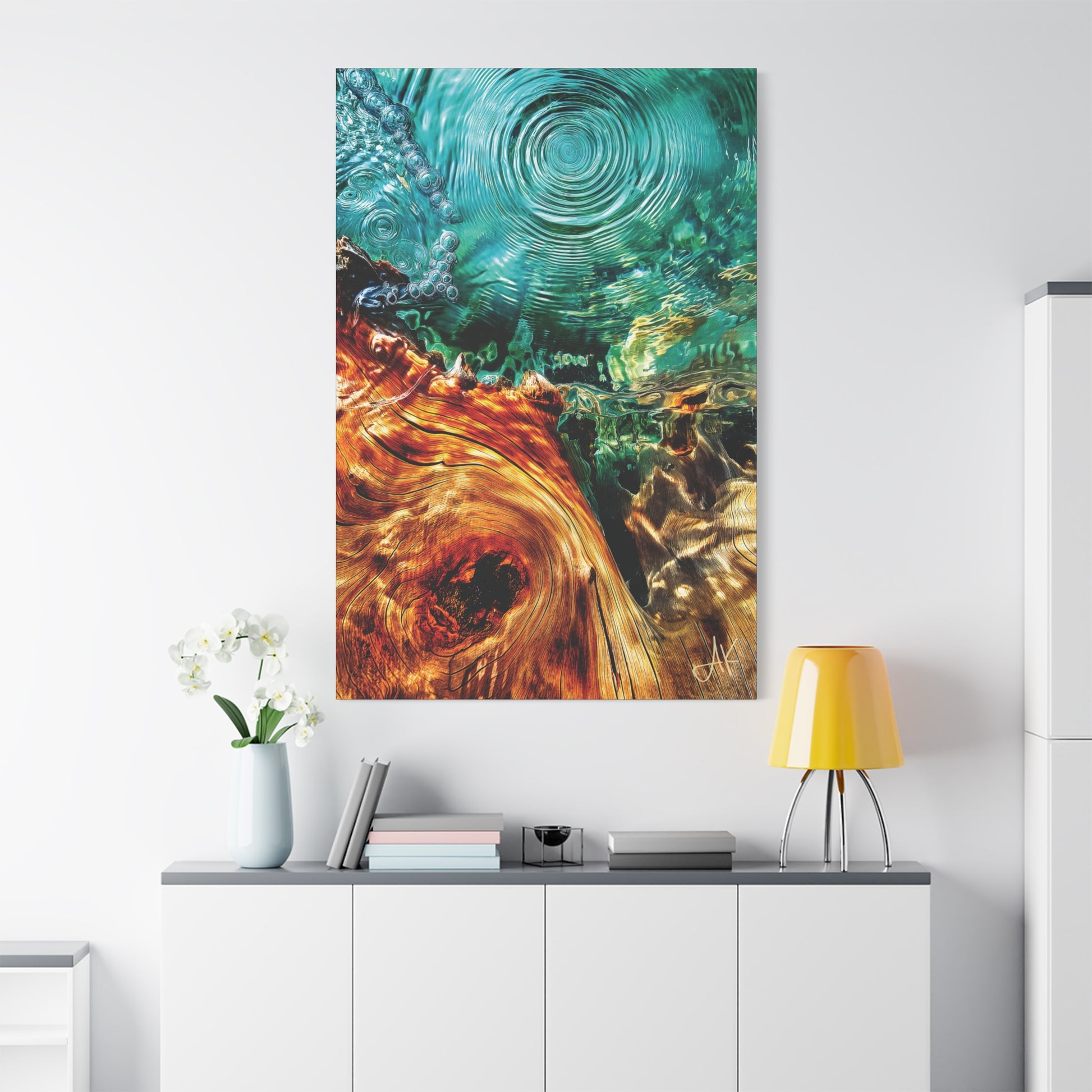 Stylistically, this is contemporary abstract photo-realism: a highly detailed surface that still reads as painting rather than photography. The concentric ripples behave almost like engraved metal or cut glass, while the timber grain rolls in long, molten bands of colour. Fine bubble chains, distortion bands, and submerged shapes give the work a layered depth – part aerial seascape, part section of wood, part spiritual diagram. The palette balances hot amber and russet against cool cyans and emeralds, creating a strong warm–cool dialogue that keeps the eye moving from well to wood and back again.