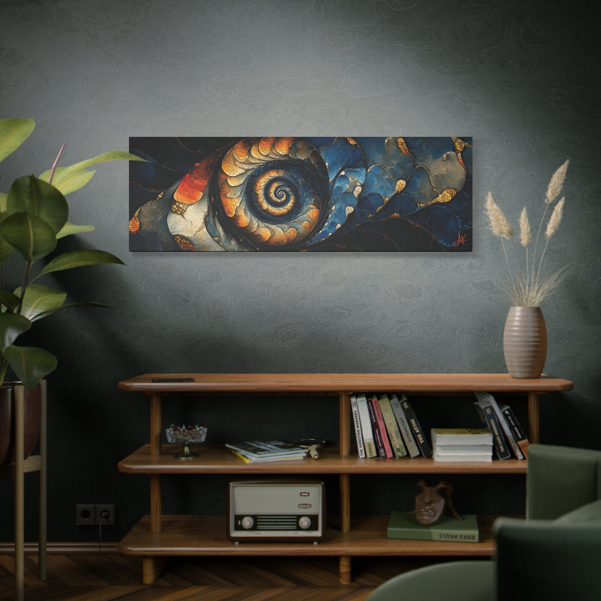 With its wide 3:1 panoramic format, Sea-Kin – In the Wake of the Ancestors is designed for long walls and horizontal sightlines: above a sofa or sideboard, along a corridor, in a study or library, or in an office reception where you want something sophisticated and quietly magnetic. It sits naturally in interiors that mix timber, stone, leather, and linen – coastal homes, modern apartments, or boutique hotels that want a nautical reference without resorting to obvious seaside motifs. For anyone who feels the pull of the sea or a deep curiosity about where their people came from, it offers a contemplative statement piece that invites you to stand still and trace the spiral’s path again and again.