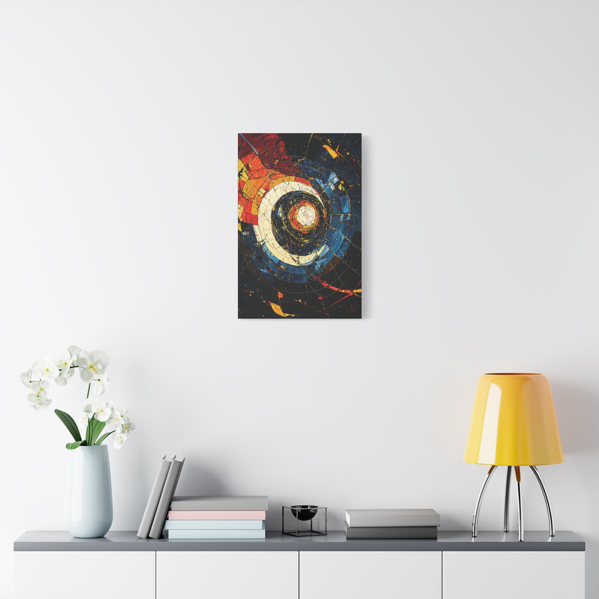 On the wall this piece works as a powerful focal point, particularly in its larger sizes. The spiral structure and strong blue–gold palette make it ideal for living rooms, hallways, and executive offices where you want a single artwork to carry a sense of depth, motion, and intellectual weight. From across the room it reads as a bold, modern abstract; up close the layered paint, fine splatter, and fracture lines reward slower looking.