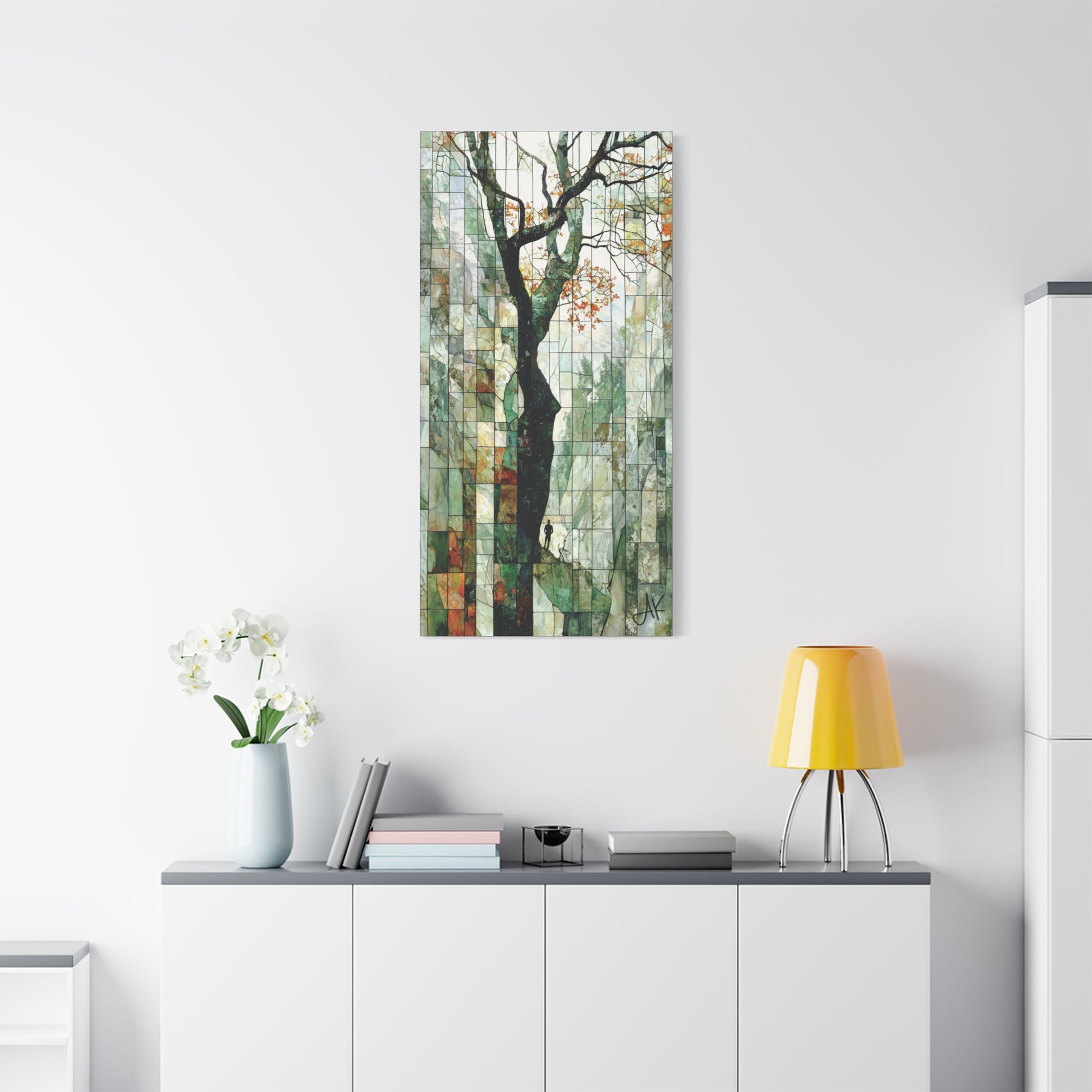 Stylistically, the work lives between stained glass window and abstract landscape. Fine black leading holds each panel in place, while painterly textures ripple across the surface like lichen on rock or light through leaves. The composition rises from the small, grounded figure at the bottom to the branching crown above, drawing the gaze upward in a single continuous movement. It’s a piece that rewards both distance and close inspection: from across the room it reads as a calm, vertical forest; up close it reveals a hidden figure, hairline fractures, and the delicate geometry of heartbreak and hope.