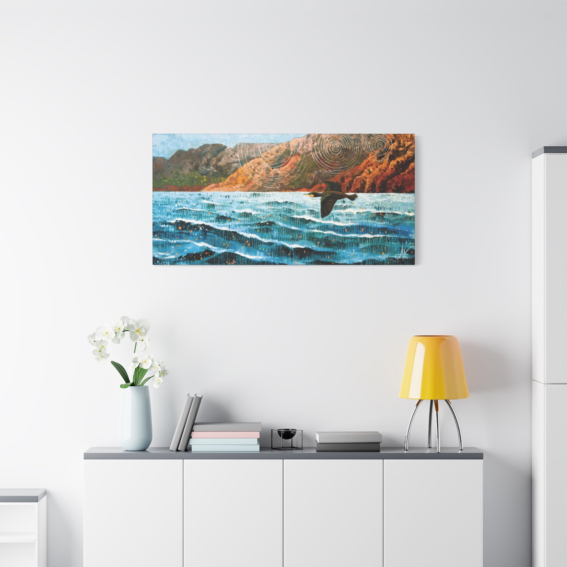 For viewers who acknowledge the world as created and held together by God, “Gannet on the Weather Edge” becomes a quiet meditation on guidance and endurance. The bird flies in the gap between cliff and sea, following lines in the air that only it seems to know. The rings suggest that nothing in this environment is random. Weather, current, and coastline all carry order and meaning and the gannet’s calm, level flight is a picture of obedience to that order. Stylistically the work sits in contemporary abstract realism: the cliffs and sea are highly tactile and painterly, the wave-edges and dripped strokes are unmistakably hand-made, and yet the whole scene is simplified into strong, graphic bands that let it read cleanly from across a room. With its wide 2:1 panoramic format, this canvas is built to anchor any space, whether above a sofa or sideboard, in a dining room, hallway, executive office, or modern lodge, this work is for people who want a serious artwork with real coastal and spiritual weight, not simple beach décor.