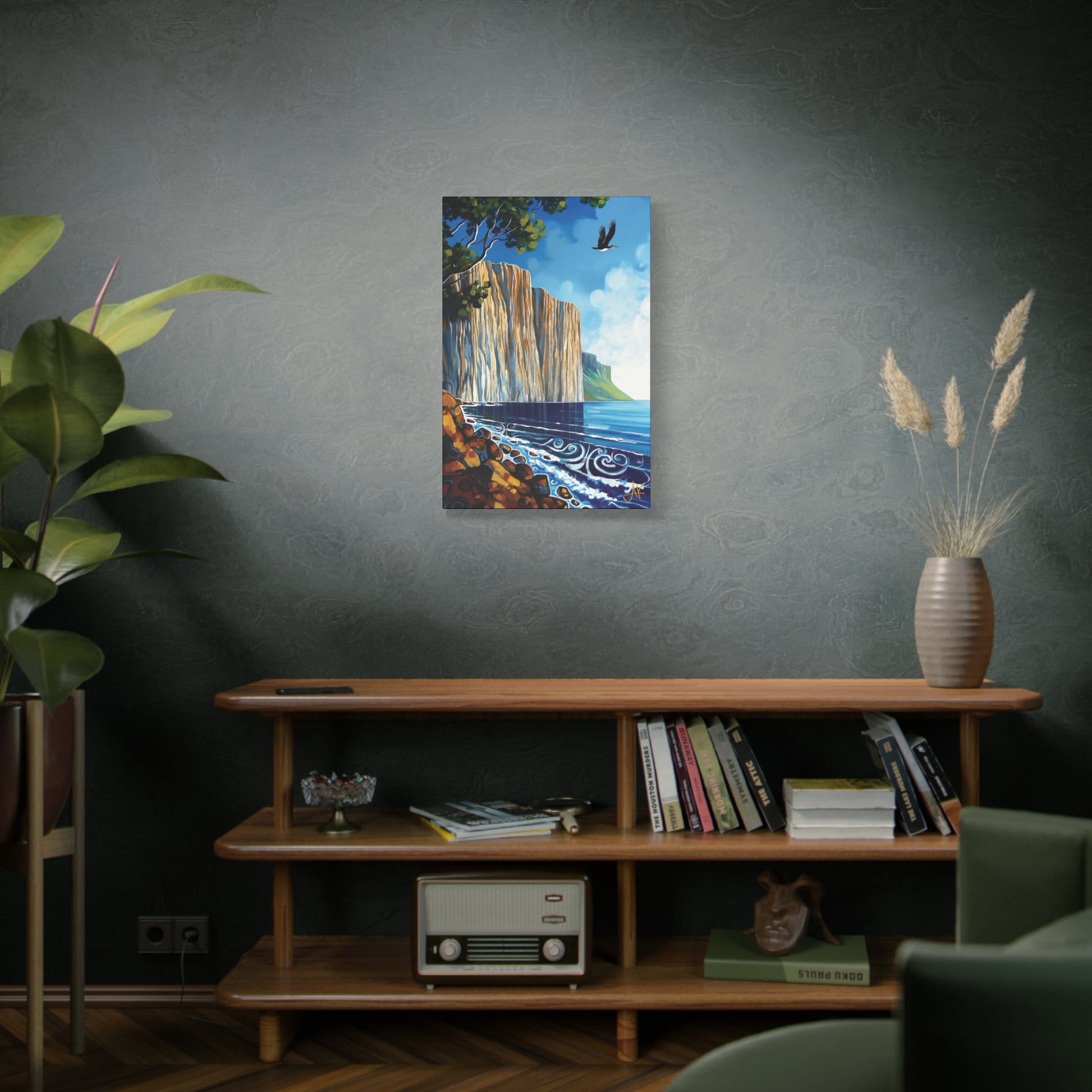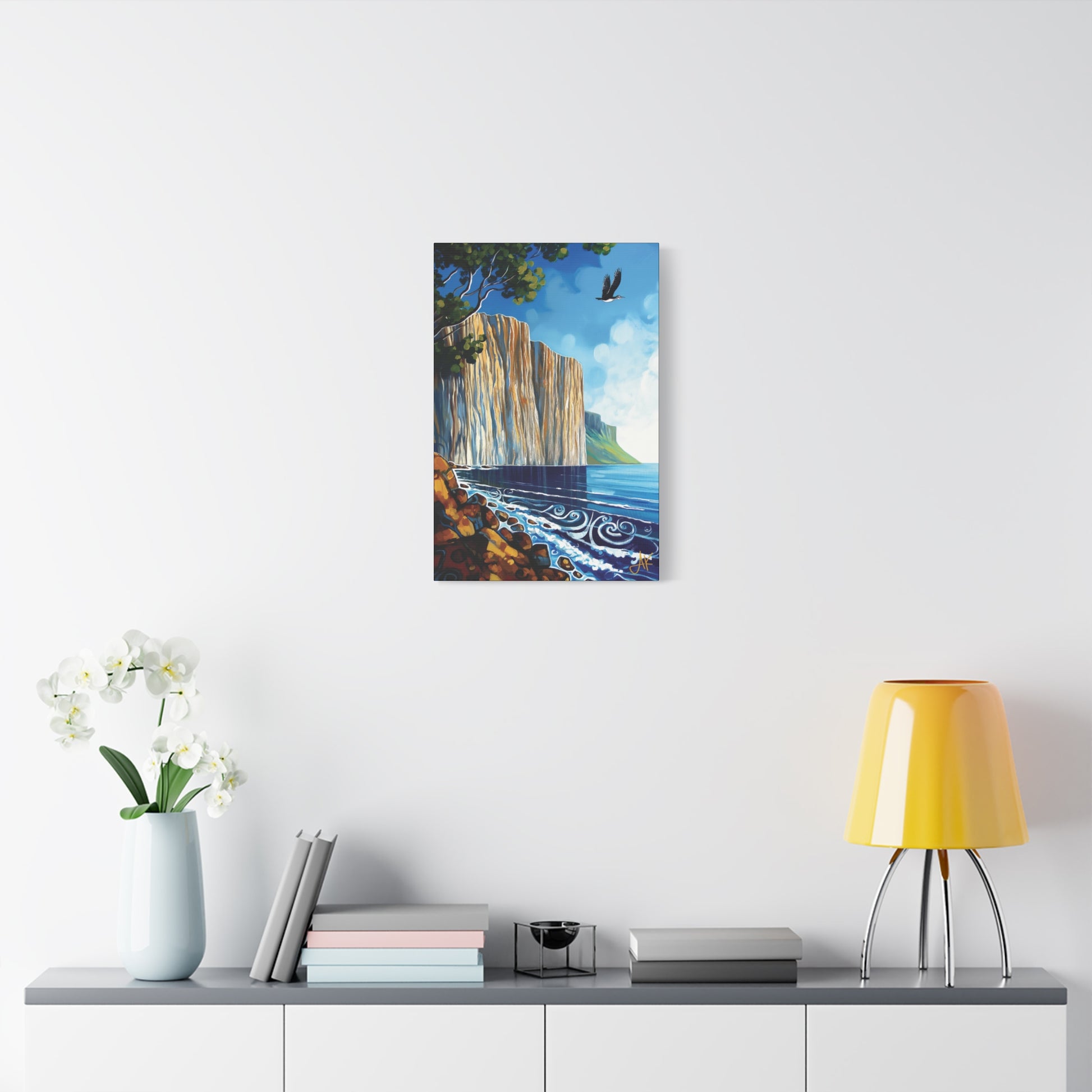 The mood is quieter and weightier than a simple sunny postcard. The light has the sharpened clarity of weather about to turn – colours deepened, shadows a little longer – while the surface of the sound remains calm. In that atmosphere the gannet reads as a watcher rather than a spectacle, a small but decisive mark of life moving over an ancient coastline. For viewers who see God’s hand in the order of sea and stone, the painting can feel like a coastal psalm: the cliff standing like a pillar, the scroll-waves tracing a kind of script, and the bird passing over as a messenger crossing the mouth of the sound.