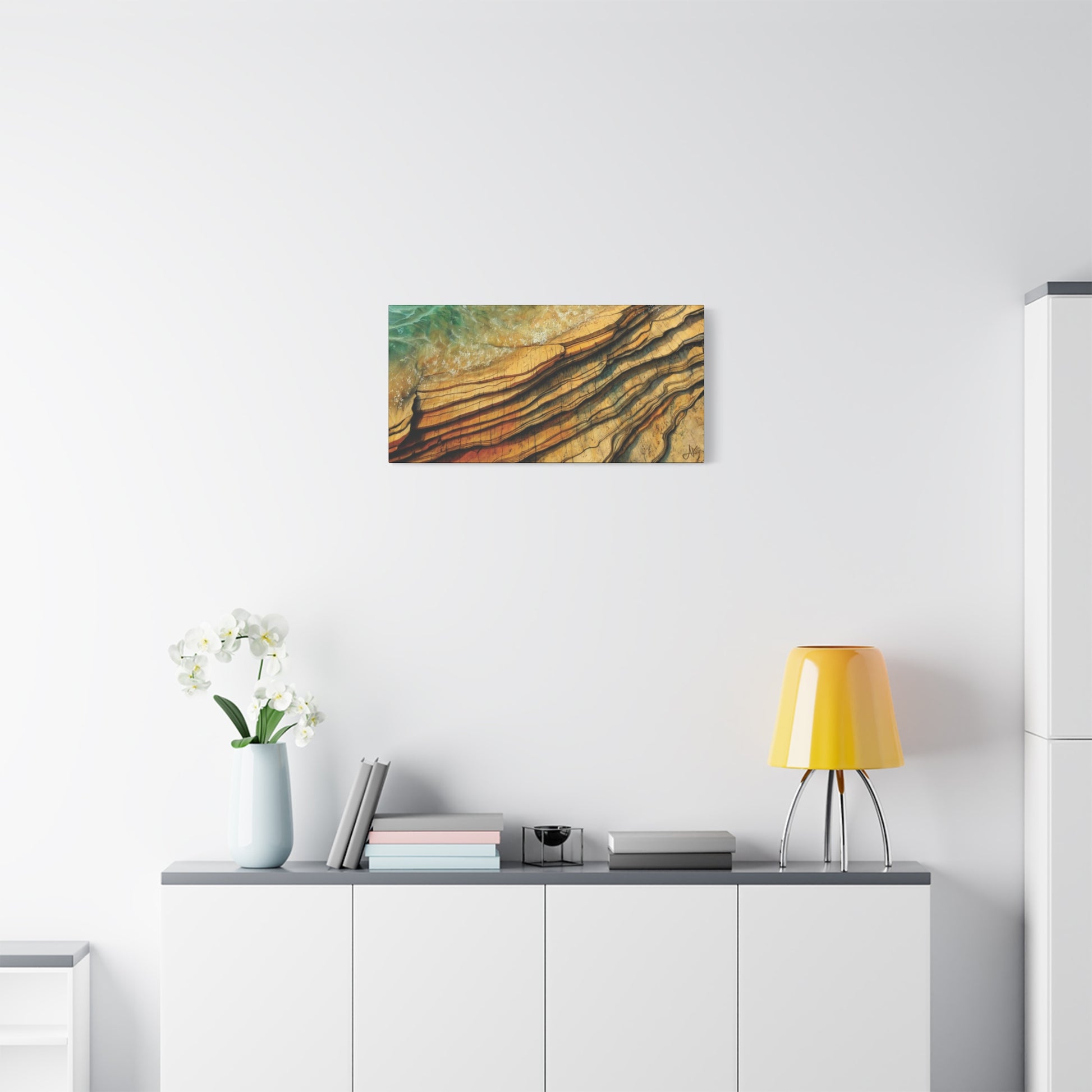 Stylistically, this is contemporary abstract realism – highly detailed and tactile, yet still clearly a painting rather than a photograph. Fine contour lines and micro-cracks give the rock shelves a carved, almost calligraphic quality, while the water retains a soft, painterly surface that keeps the image from feeling mechanical. With its wide 2:1 panoramic format, Tales Spoken by Land & Sea is designed to anchor a room: above a sideboard or console, over a sofa, along a hallway, or as a statement piece in a study, library, or coastal home. It pairs naturally with modern interiors that want a serious artwork rather than simple beach décor, and it quietly complements spaces shaped by faith, memory, and a love of the Gaelic shore.