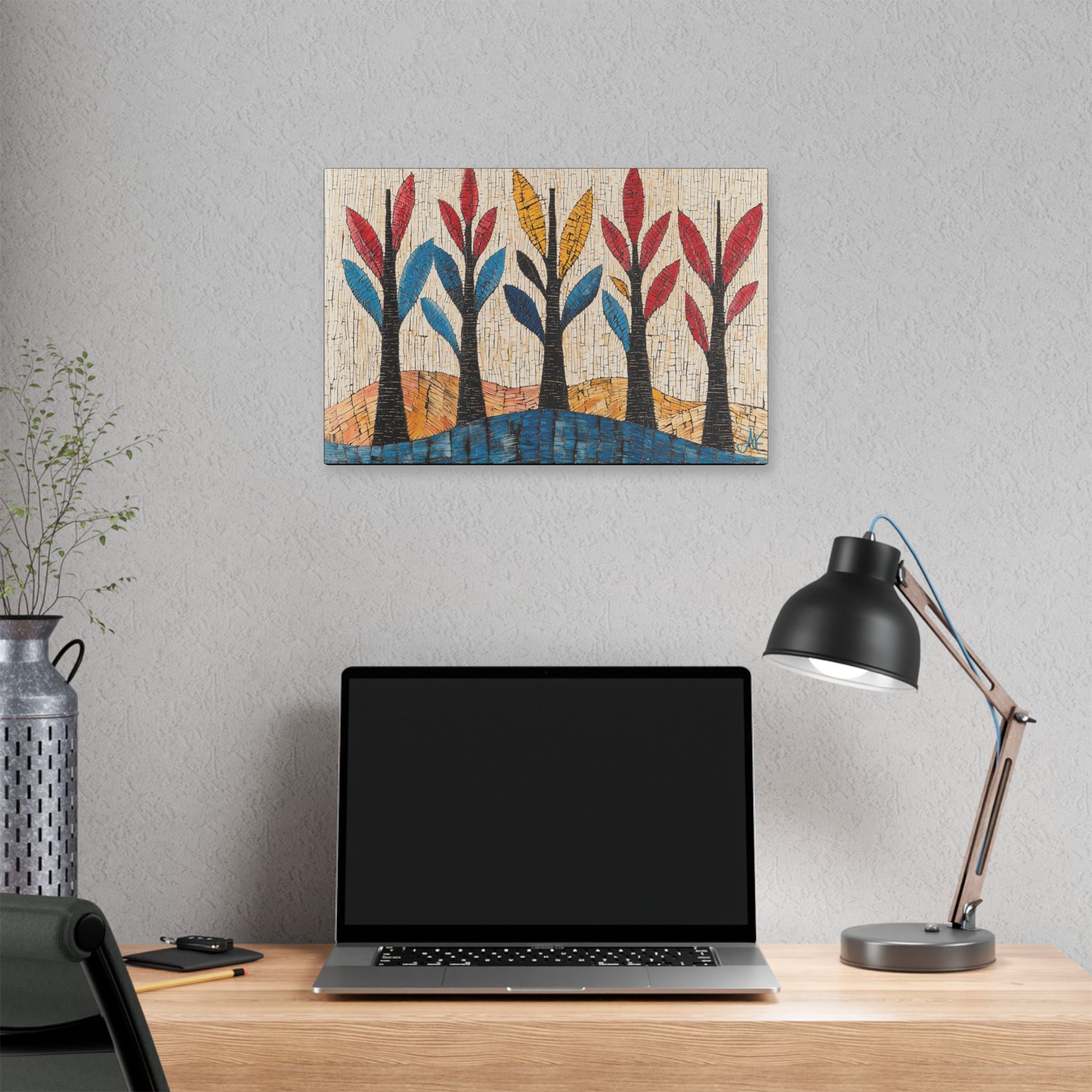 Stylistically, Tidal Grove sits between contemporary abstract landscape and modern mosaic art. The strong silhouettes and rhythmic spacing make it easy to read from across the room, while close up the surface breaks into intricate, tessellated marks that feel hand-set and richly textural. On the wall this horizontal canvas works beautifully above a sideboard, sofa, or dining table, especially in coastal, Queensland-inspired or nature-focused interiors where colour, warmth, and pattern are welcome but clutter is not.